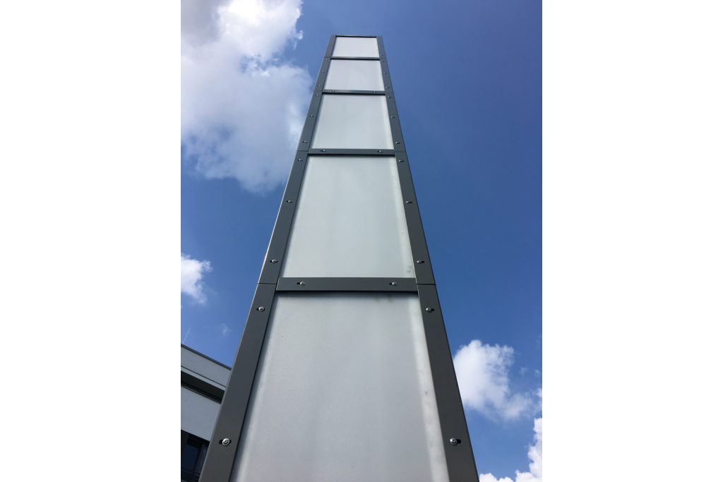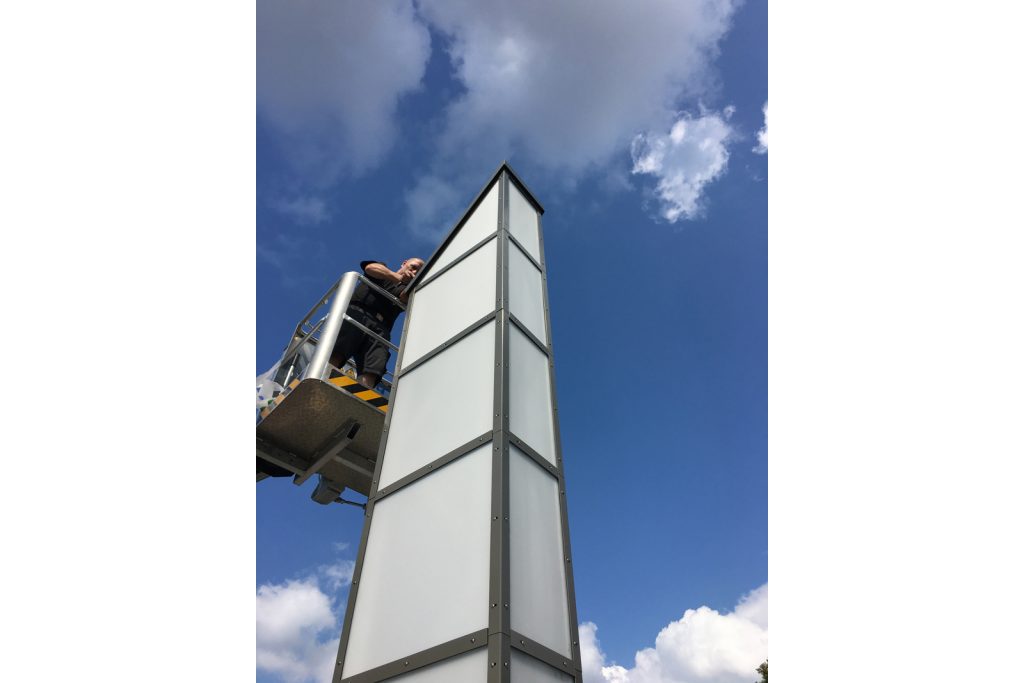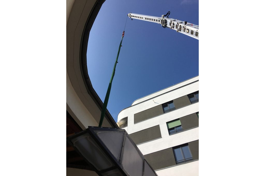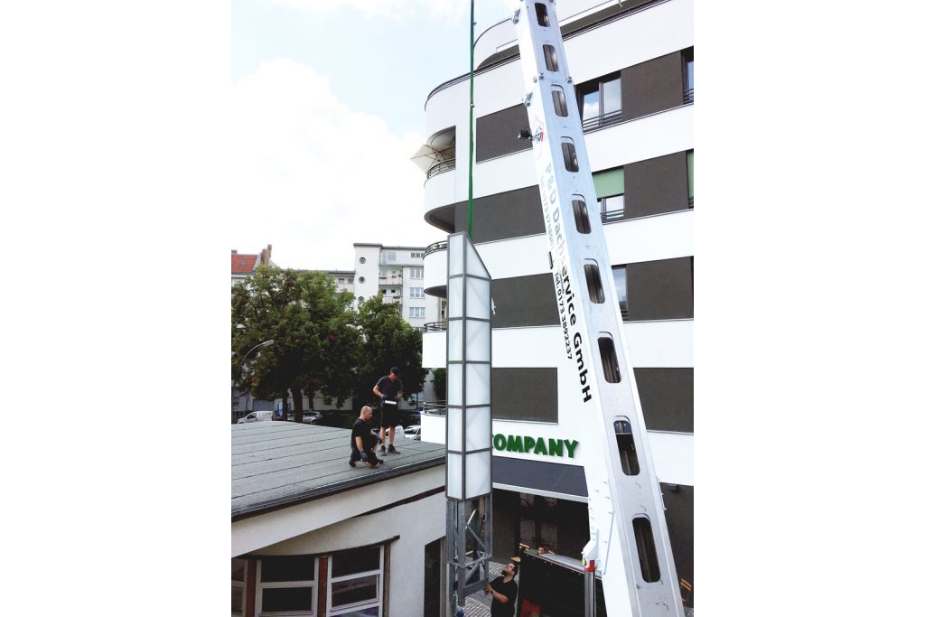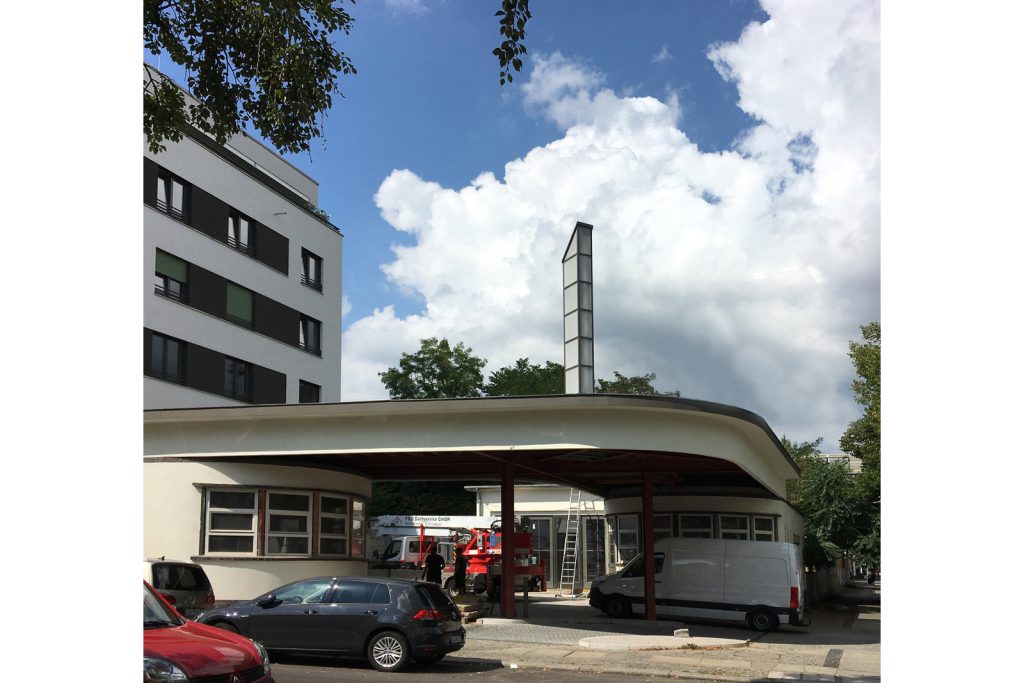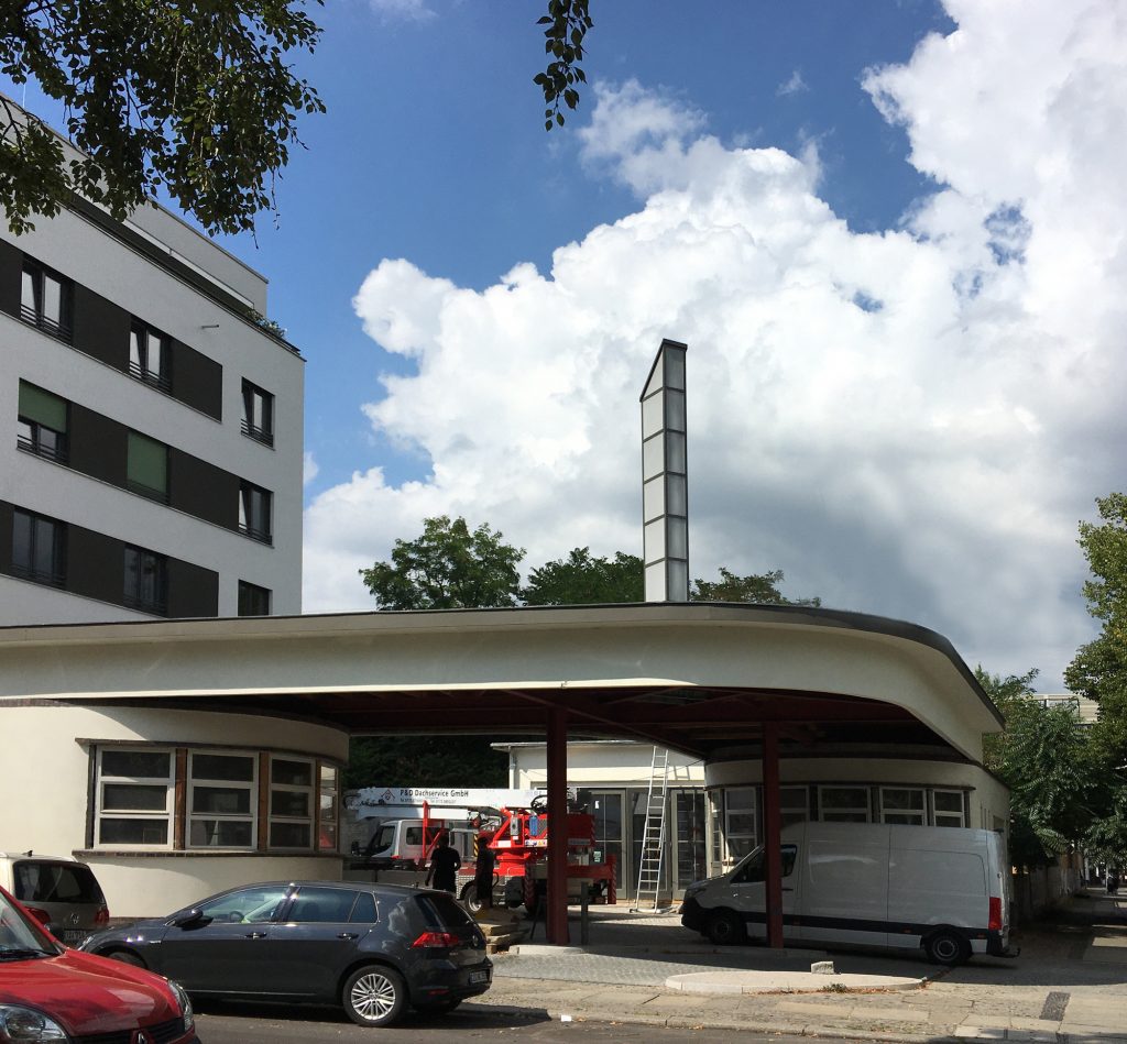 Bei der Sanierung der denkmalgeschützten Holtzendorff-Garage von 1929 in Berlin-Charlottenburg ist ein weiterer Meilenstein erreicht: der Pylon auf dem Dach der Garage wurde originalgetreu nachgebaut und wieder aufgestellt. Nachts ist der Turm beleuchtet. Mehr zum Projekt hier