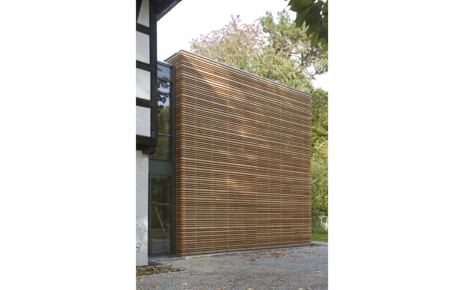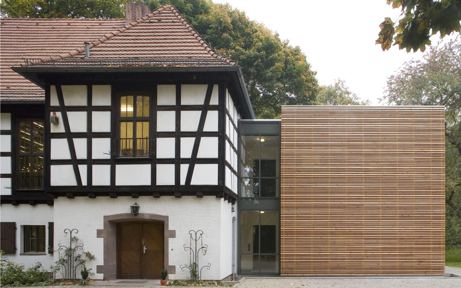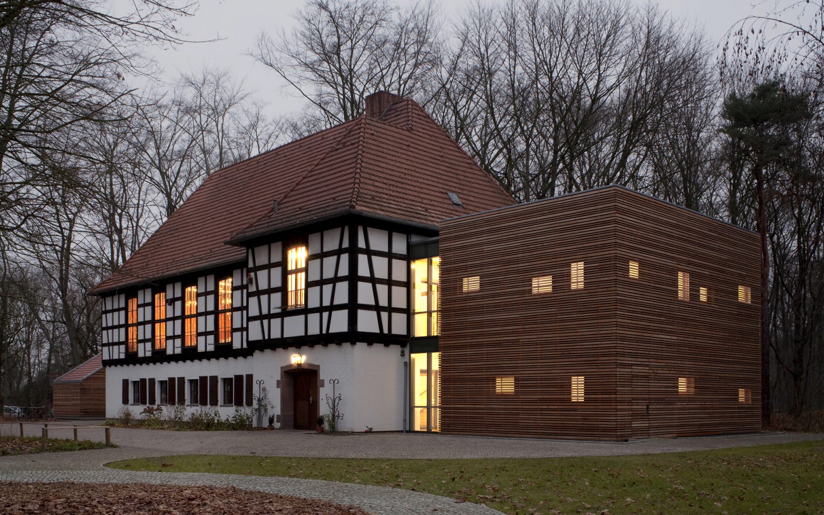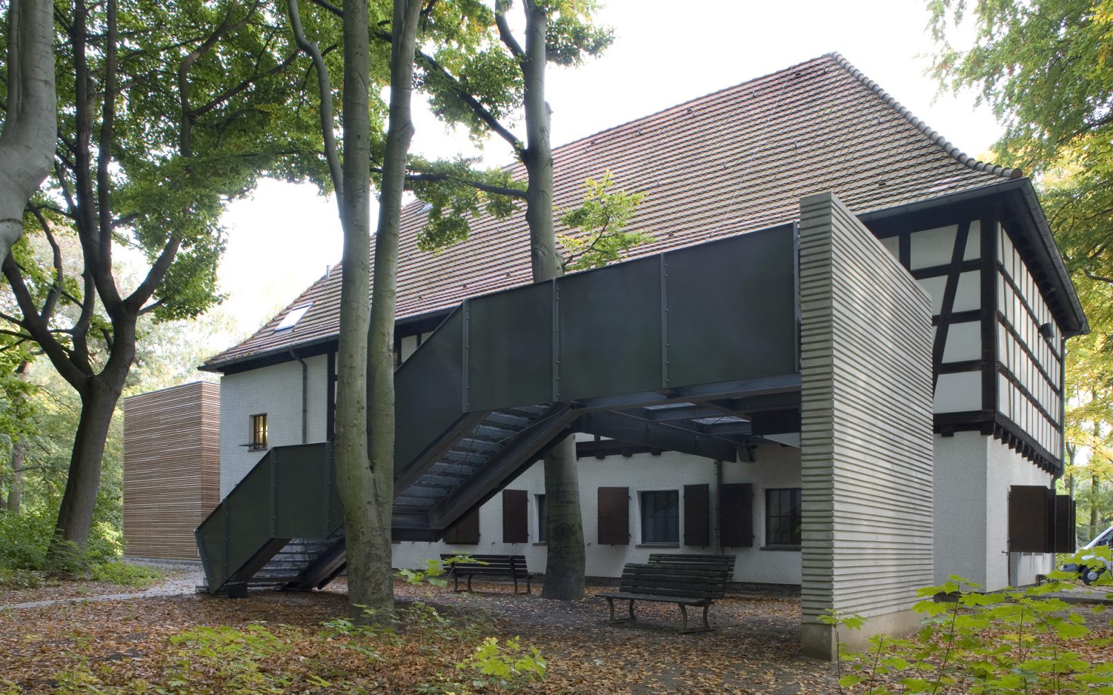 Durch einen Anbau konnte das denkmalgeschützte Familienheim am Dohnagestell in Berlin-Wedding zu einer barrierefreien Begegnungsstätte umgebaut und so für Menschen mit Behinderung erschlossen werden. Das zweigeschossige Bestandsgebäude liegt inmitten des Gartendenkmals Rehberge und wurde in den 1930er-Jahren als Jugendheim errichtet. Der neu angefügte Kubus nimmt die Materialität des Altbaus auf, setzt sich aber mit seiner Form selbstbewusst davon ab und interpretiert ihn gleichzeitig. Zwischen Alt- und Neubau dient ein schmaler Glaskörper als verbindende Fuge, in der ein Aufzug das Obergeschoss barrierefrei erschließt. Im Obergeschoss des Altbaus wurde ein Veranstaltungsraum eingerichtet. Daneben dient ein großzügiges Treppenpodest zum einen als Rettungsfläche für Rollstuhlfahrer, zum anderen als Terrasse mit Blick ins weite Grün.
