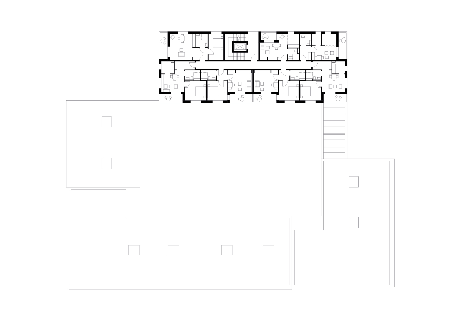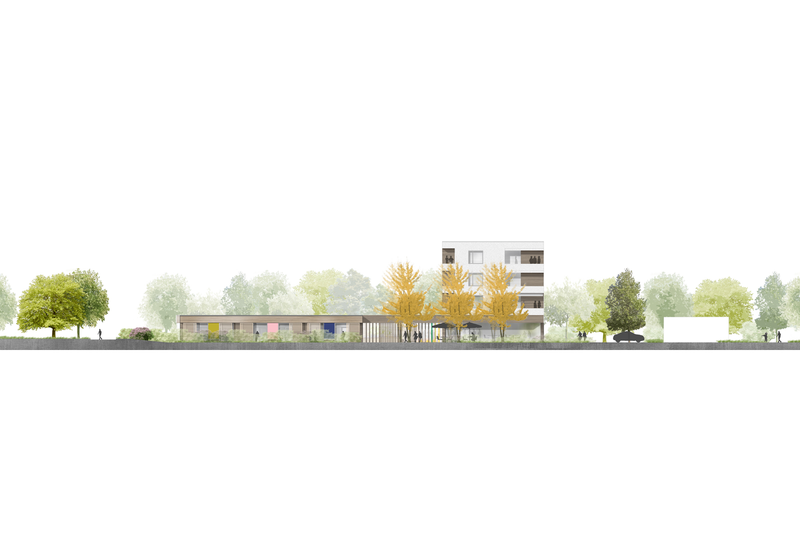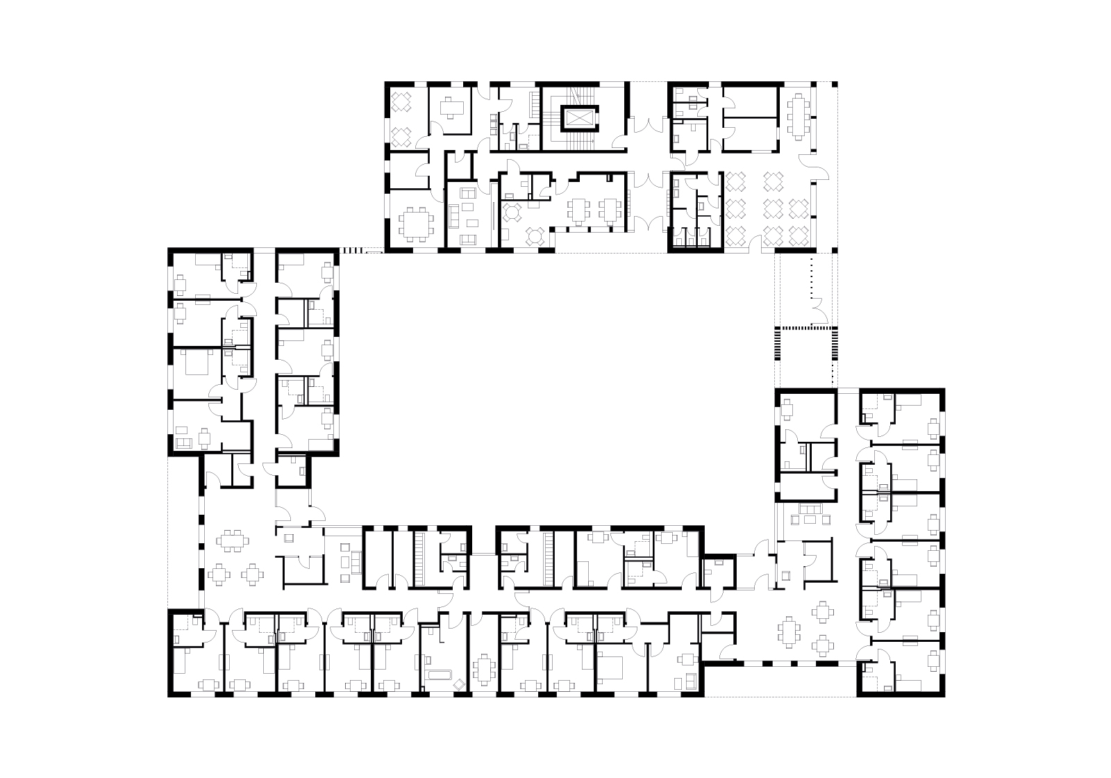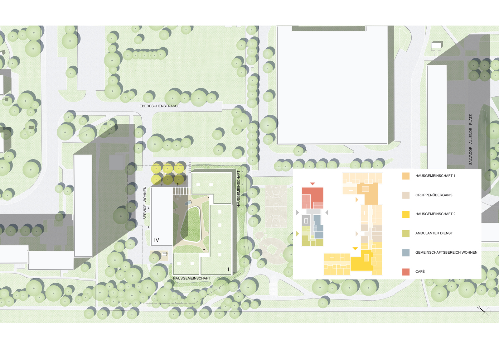 Der Entwurf setzt das Raumprogramm in zwei Baukörpern um, die sich durch ihre unterschiedliche Ausdehnung und Höhe klar voneinander absetzen und die beiden Wohnformen – Hausgemeinschaften und Servicewohnen – städtebaulich ablesbar machen. Gleichzeitig formen sie ein Ensemble um einen Hof, der als ruhige, den Bewohnern und ihren Besuchern vorbehaltene Freifläche das bauliche und atmosphärische Zentrum bildet. Das viergeschossige Wohnhaus schirmt die Anlage gegen die Großzeilen im Nordwesten ab.