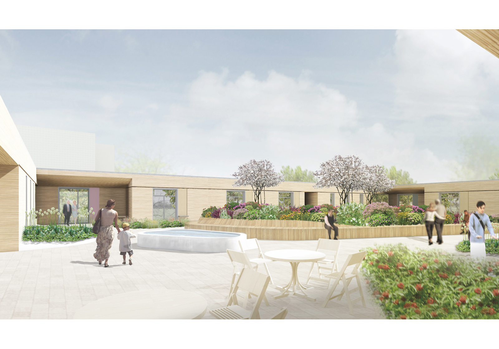 Dem eingeschossigen Bauteil für die beiden Hausgemeinschaften liegt die Idee eines unmittelbaren Wohnens zu ebener Erde zugrunde: Jeder Bewohner hat einen direkten Zugang zum Hof und dem beschützenden Garten, der als assistenzfreier Außenraum ausgebildet ist. Um den Bedürfnissen von Menschen mit Demenz gerecht werden zu können, sind die Wohngemeinschaften als übersichtliche Raumfolgen ausgebildet, die eine intuitive Orientierung ermöglichen.