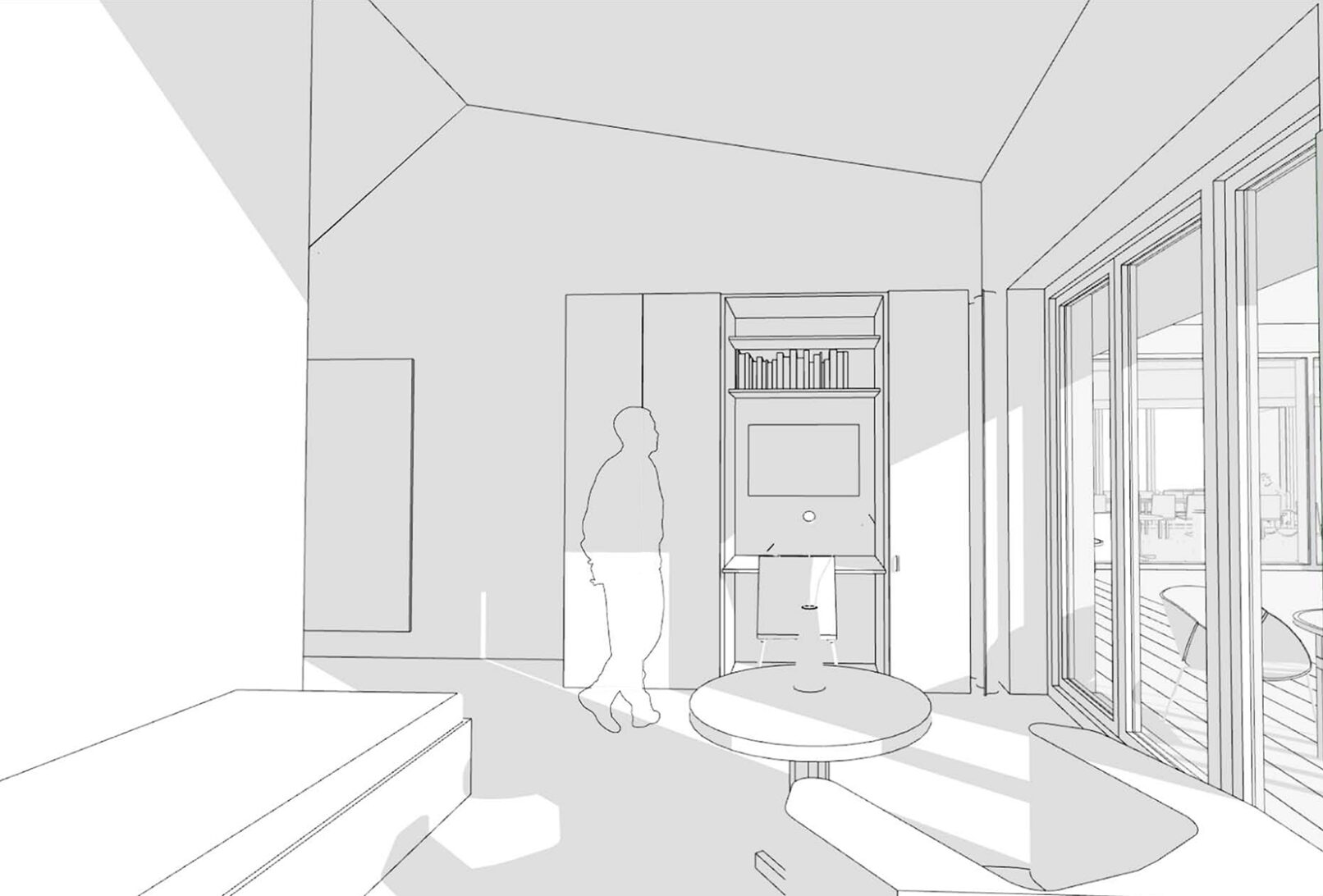 In den Häusern ist die Neigung der Dächer erlebbar. Gegenläufig geneigte Decken bilden in den Gästezimmern und im Raum der Stille räumliche Haus-im-Haus-Situationen. In den Fluren spenden Oberlichter einen adressierenden Tageslichteinfall über den Eingangsnischen der Gästezimmer.