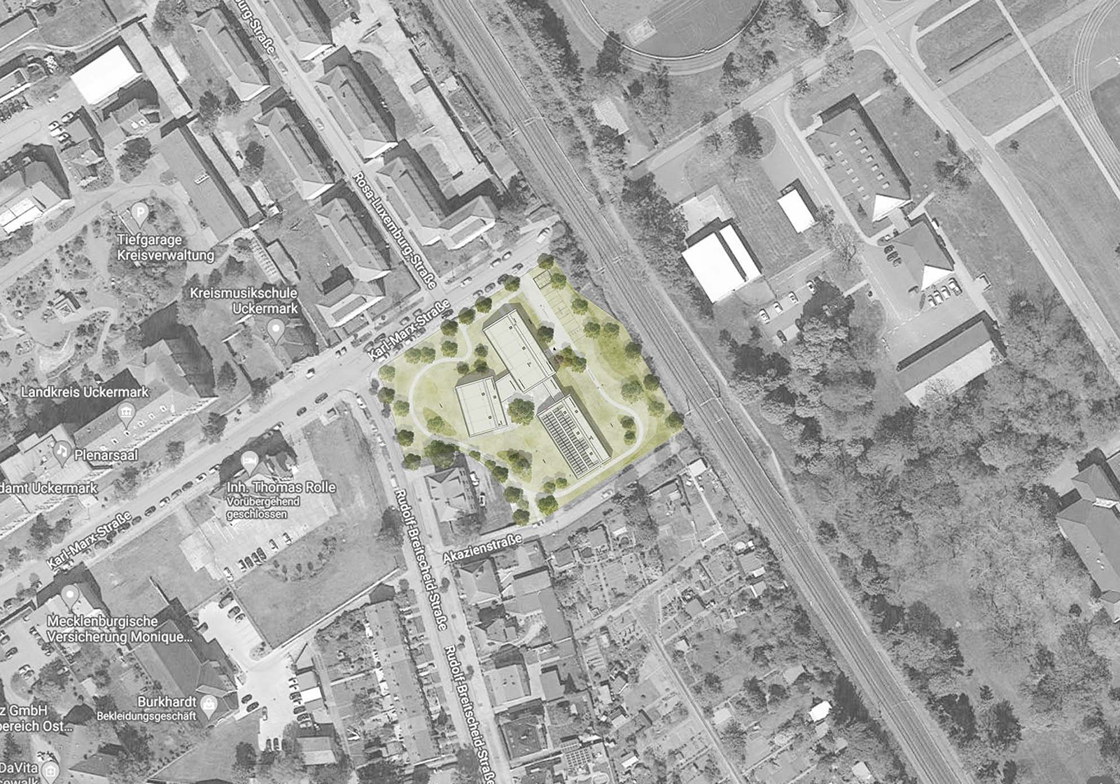 Das ca. 5.900 Quadratmeter große Baugrundstück liegt nahe dem Stadtzentrum zwischen zwei- und dreigeschossigen Wohnbauten und Kleingärten.