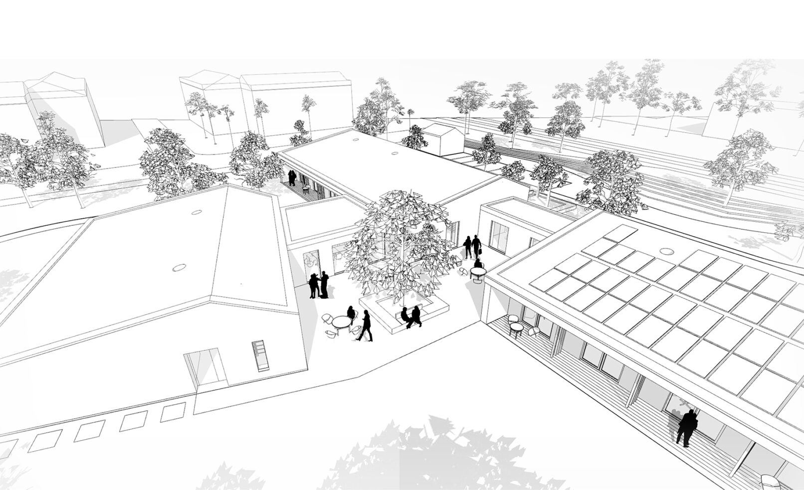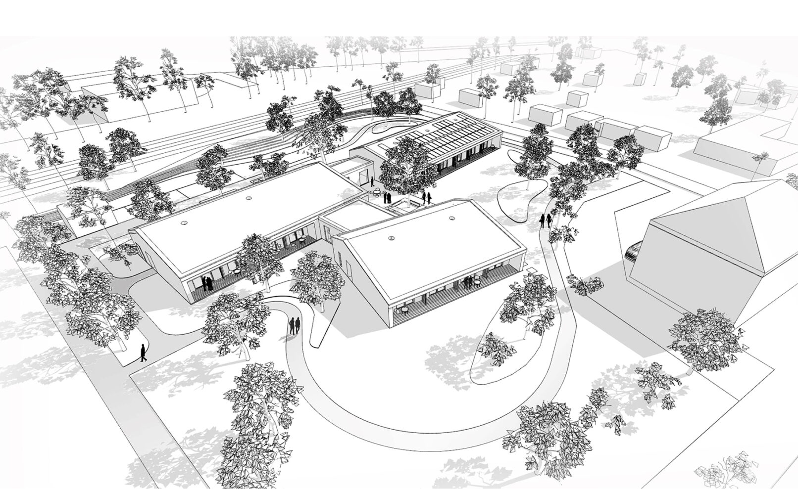 Das barrierefreie Hospiz gliedert sich in drei eingeschossige Einzelhäuser mit asymmetrischen Satteldächern, die durch Wohnküche und Passage verbunden sind. Diese Gliederung schafft geschützte Außenräume und Gartenbereiche mit hoher Aufenthaltsqualität.
