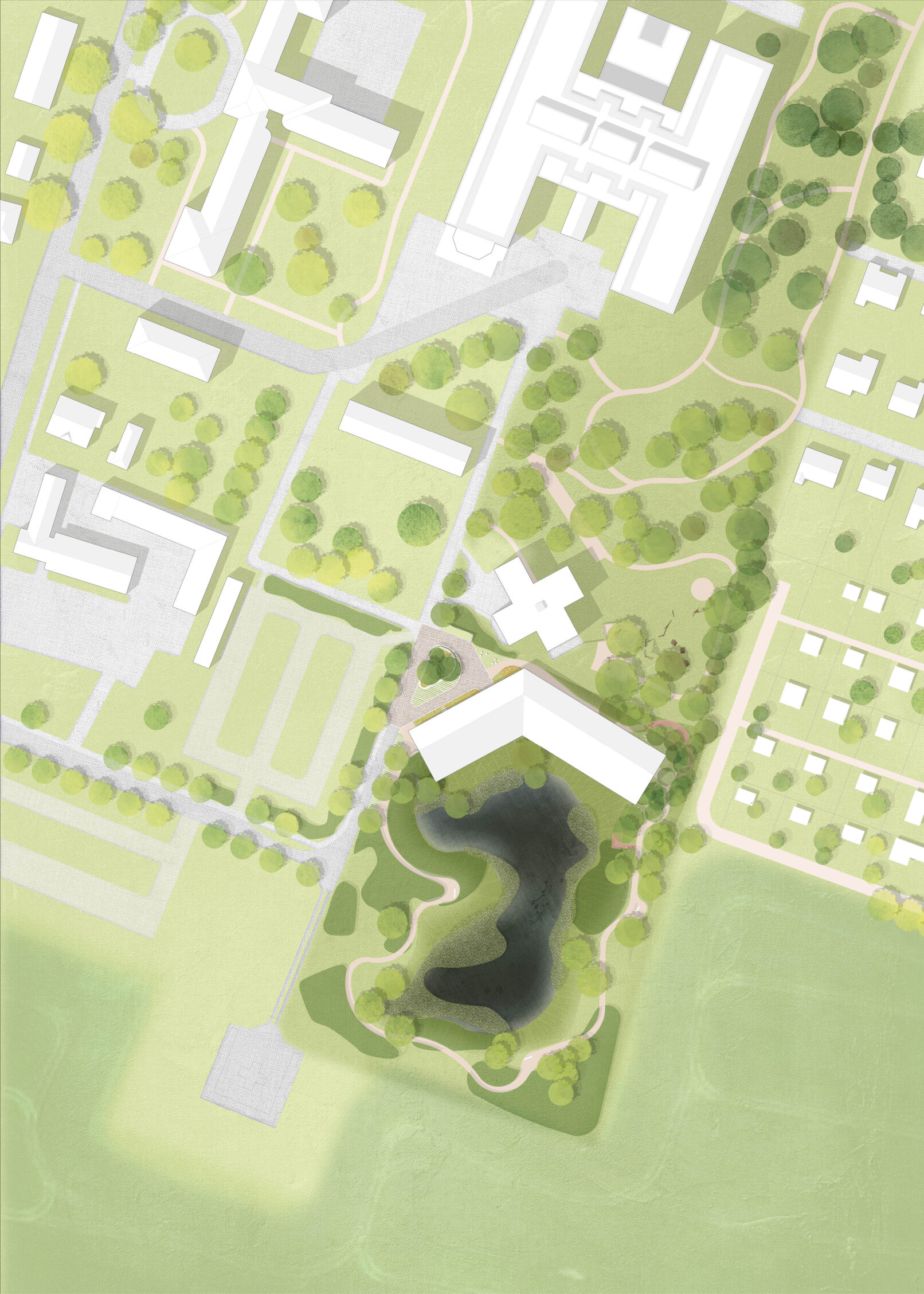 Das Gebäude übernimmt das Höhenniveau des Vorplatzes, entwickelt einen Betonsockel und kragt wie ein aufgestelztes Bootshaus über die Böschung zum Weiher. Das Raumprogramm liegt vollständig auf einer Ebene; West- und Ostflügel treffen sich im Gemeinschaftsbereich als Zentrum des Hauses.