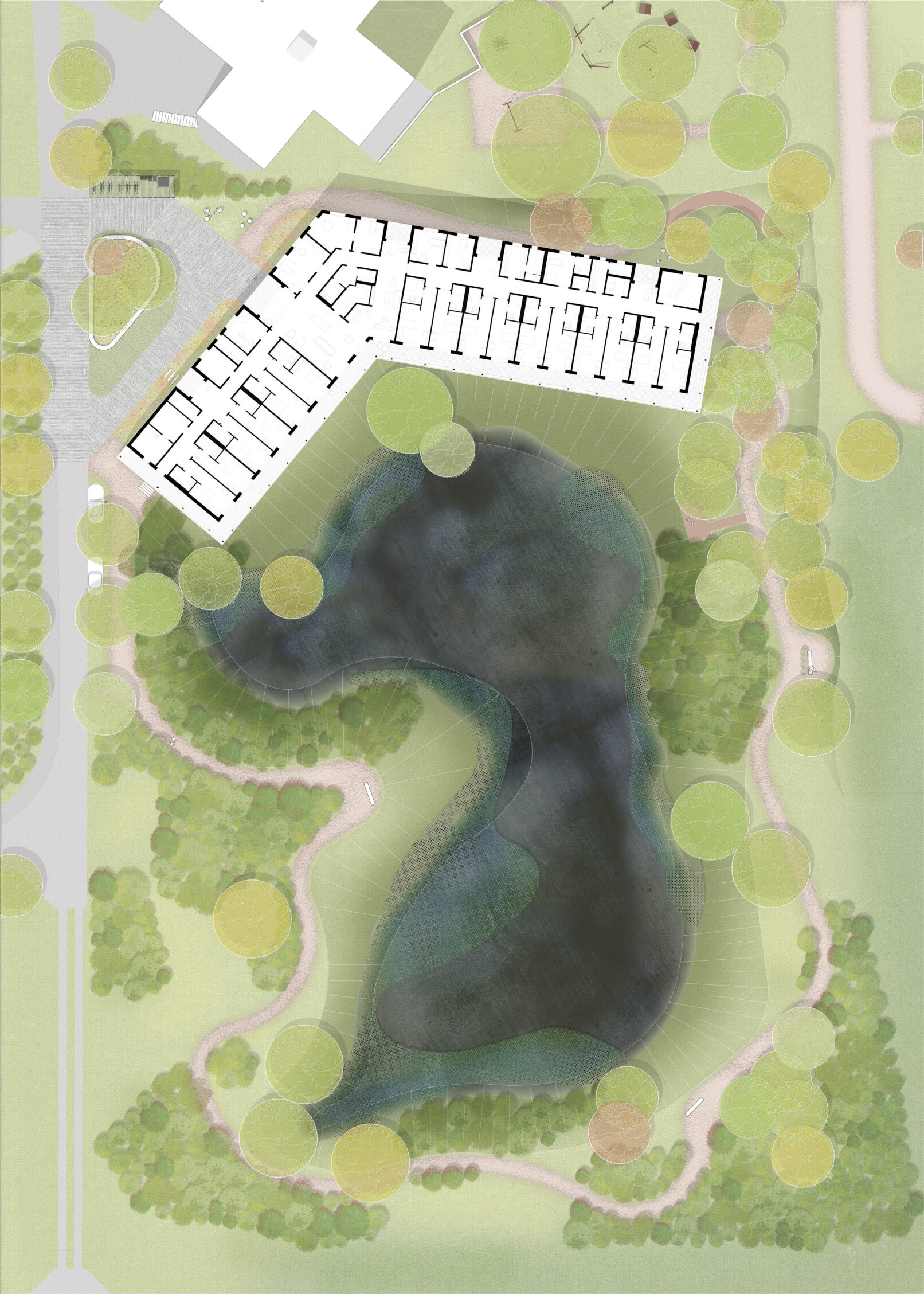 Im nördlichen Riegel liegen dienende Funktionen und fünf Einschnitte: Eingang und vier Terrassen, die den Erschließungsflur belichten und Aufenthaltsorte für Rückzug und kurze Gespräche bieten. Gästezimmer und Gemeinschaftsbereich orientieren sich zum Weiher mit tiefen, überdachten Loggien, die auch im Pflegebett genutzt werden können und geschützte Blicke in die Landschaft ermöglichen.