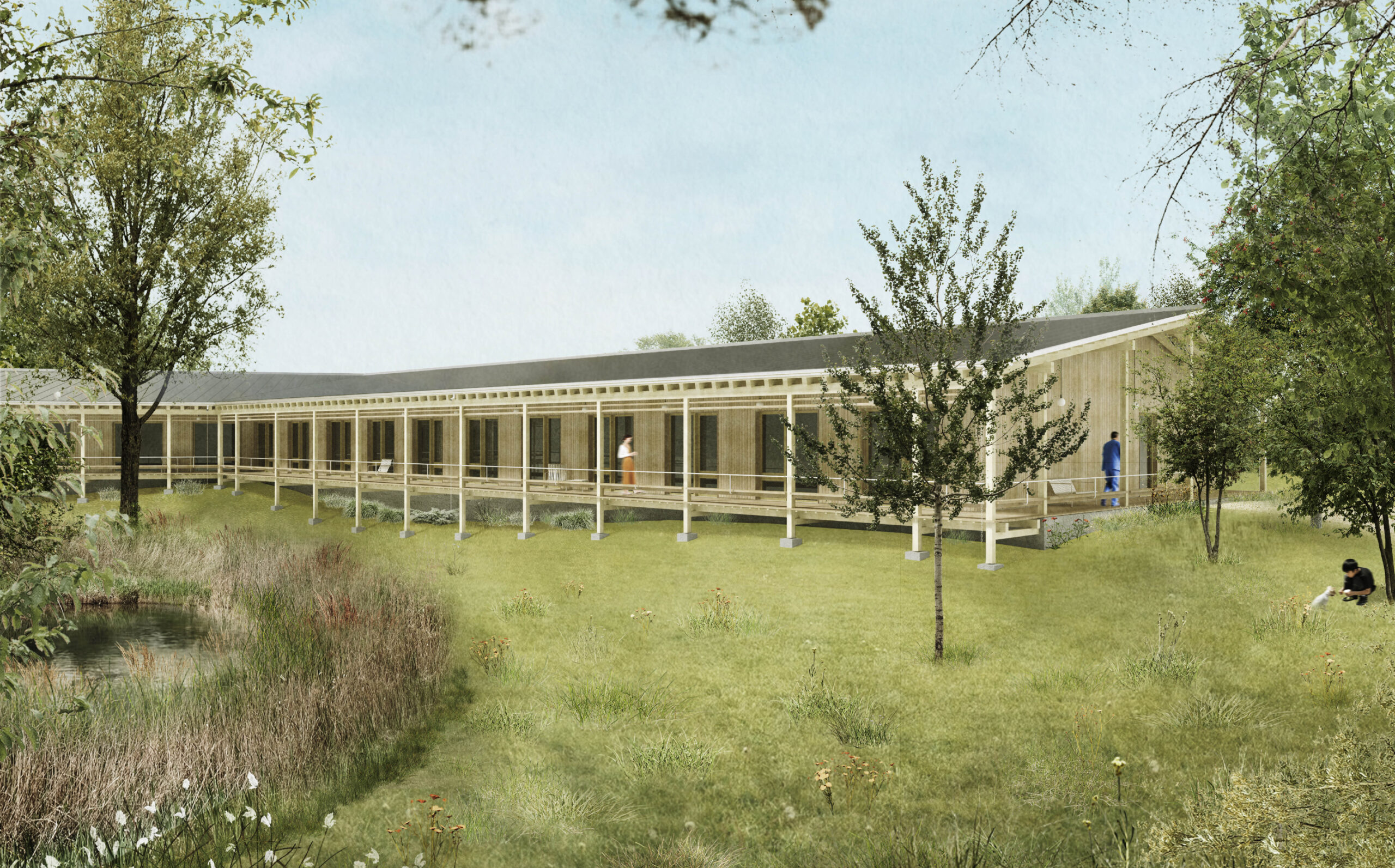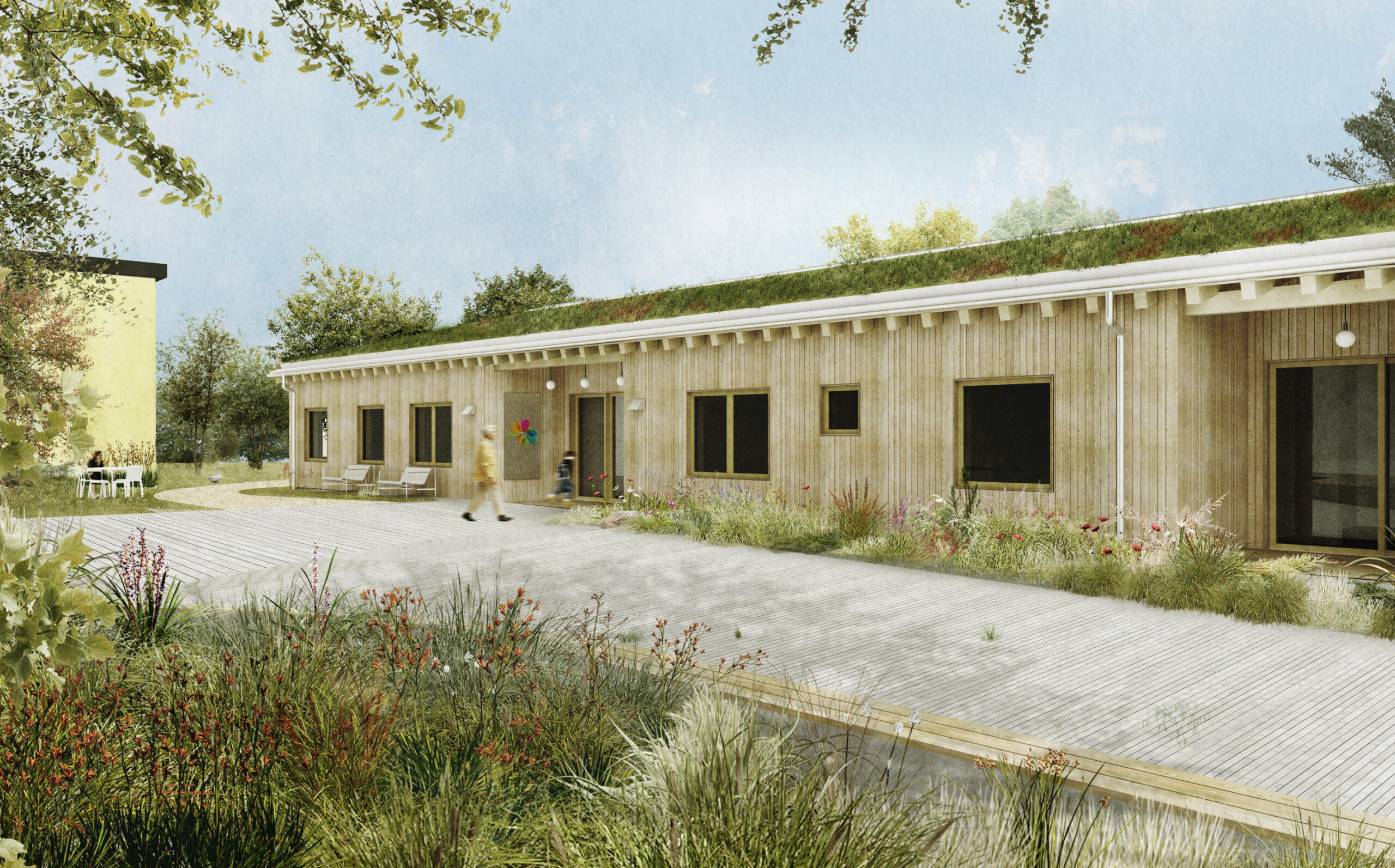 Im Rahmen eines Wettbewerbs wurden Feddersen Architekten mit einer Studie für ein Hospiz südlich der Havelland-Klinik beauftragt. Wir entwickelten für das Hospiz am Rand der Siedlung ein winkelförmiges, scheunenartiges Gebäude am biotopartigen Regenwasserbecken. Der Baukörper mit Satteldach schmiegt sich an den Schilfsaum und formuliert klare Innen- und Außenräume im Übergang zwischen Siedlung und Natur.