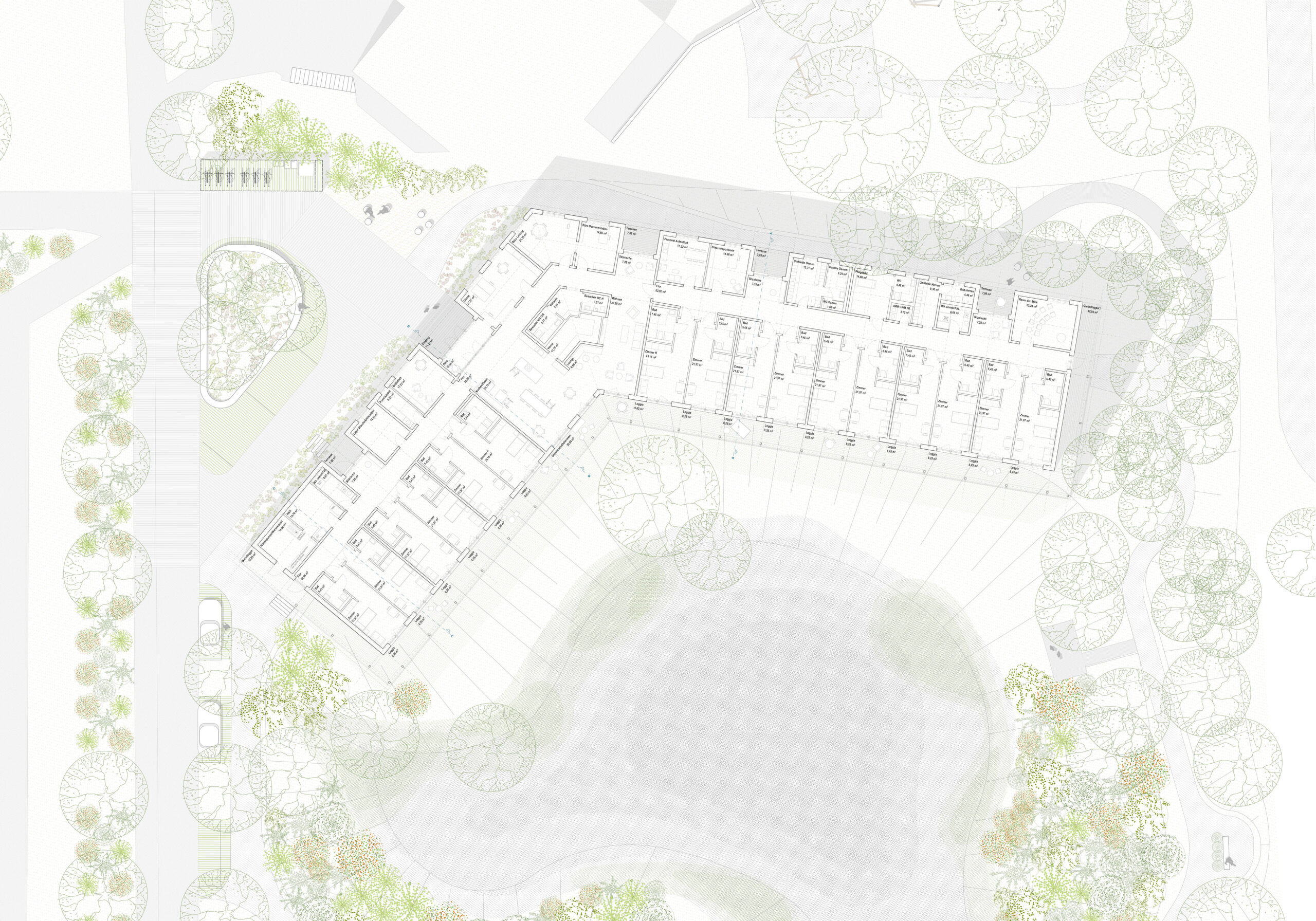 Der Westflügel bildet einen großzügigen Vorplatz als Adresse des Hauses. Er bündelt Wege, bindet Parkflächen an und wird dank Sitzgelegenheiten unter bestehenden Bäumen zu einem einladenden Aufenthaltsort. Barrierefreie Stellplätze fügen sich unaufdringlich ein, Platz und Straße sind als Shared Space gestaltet.