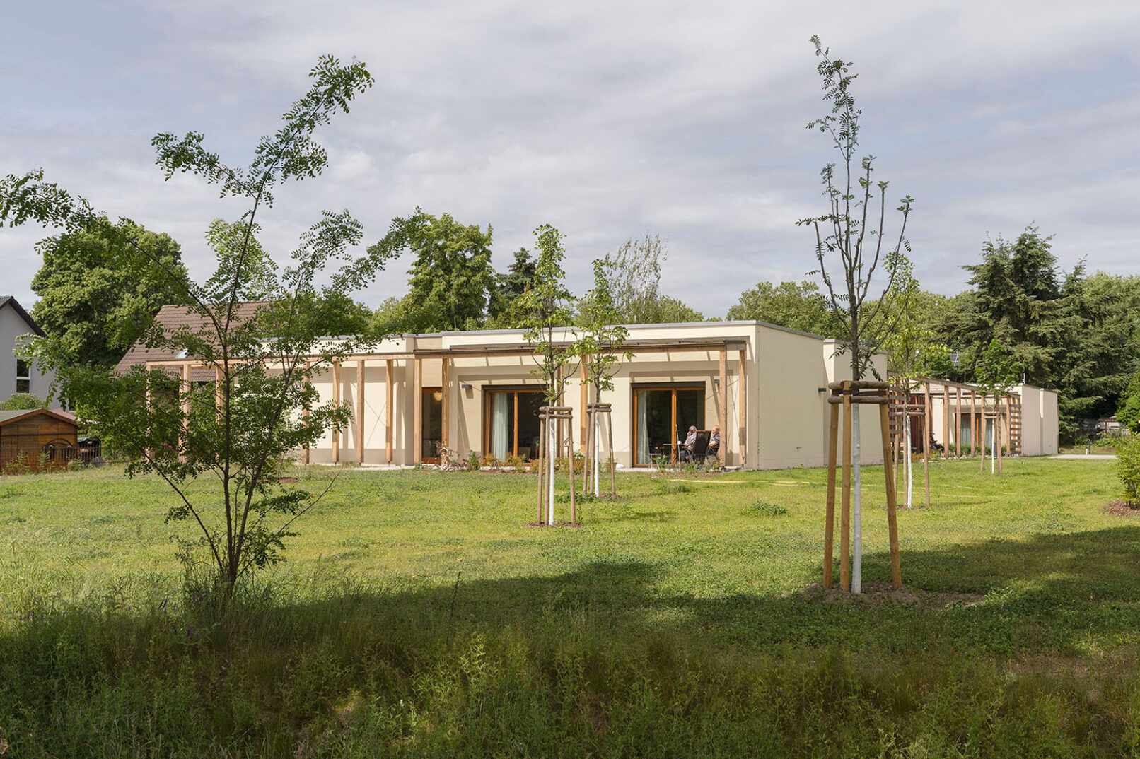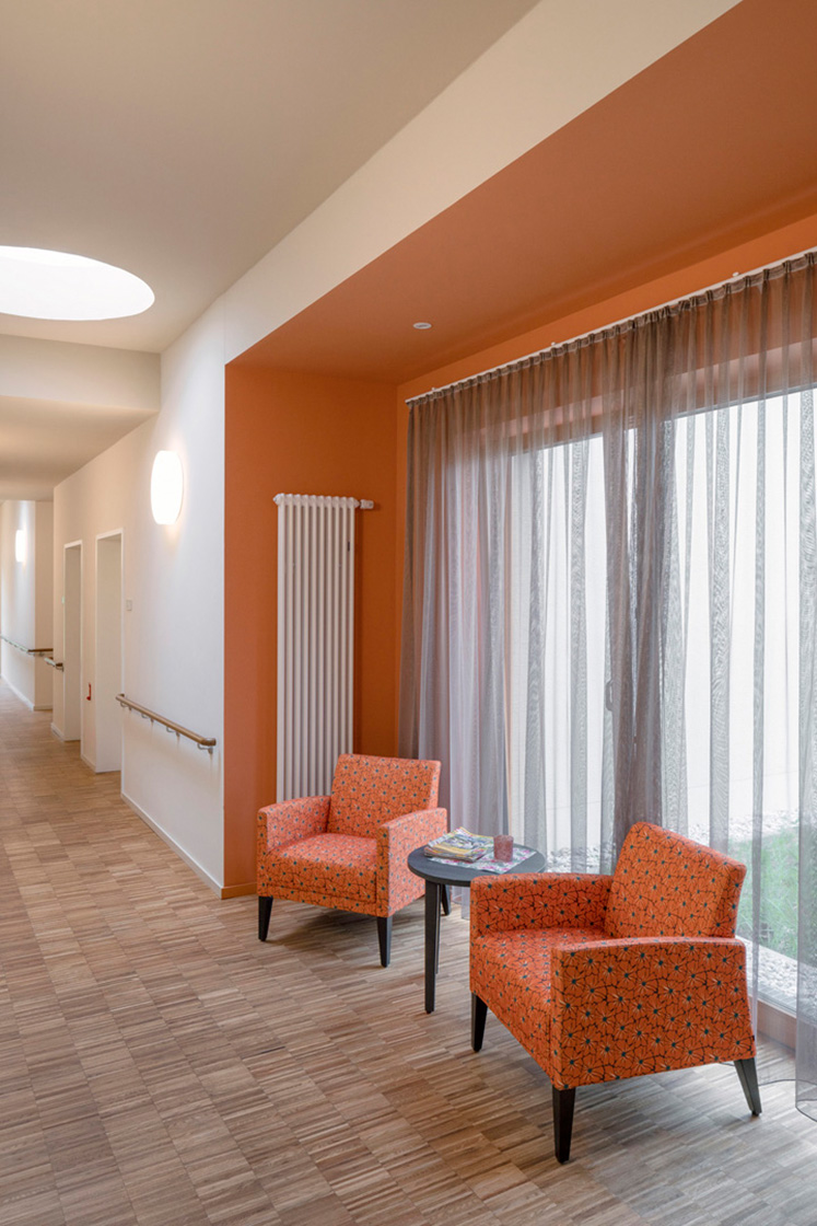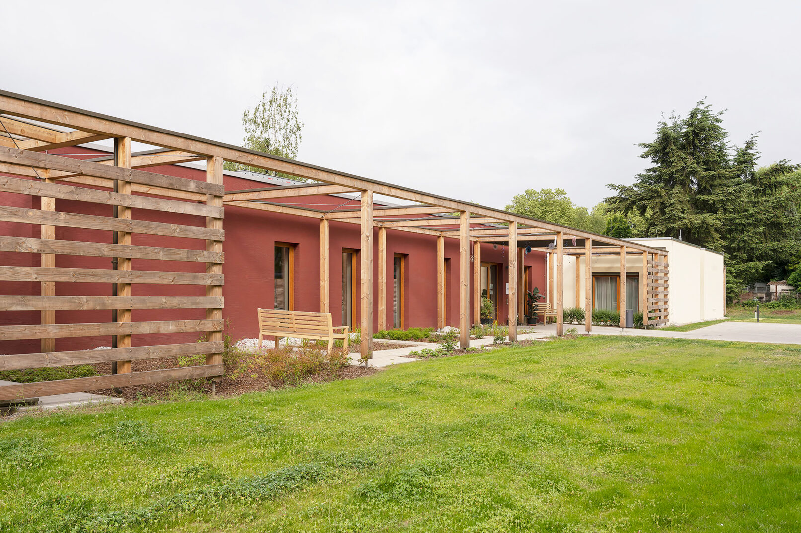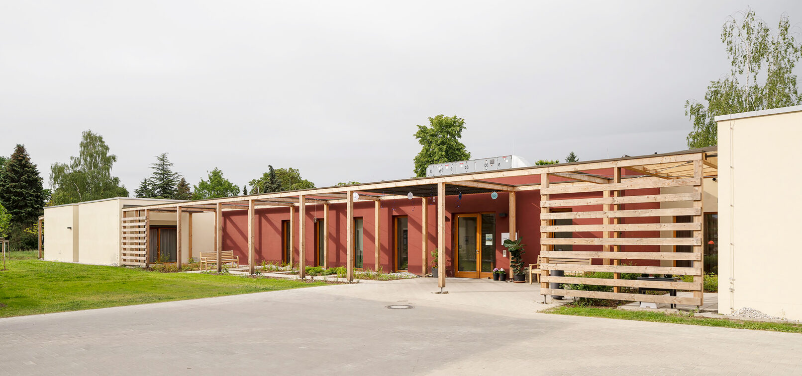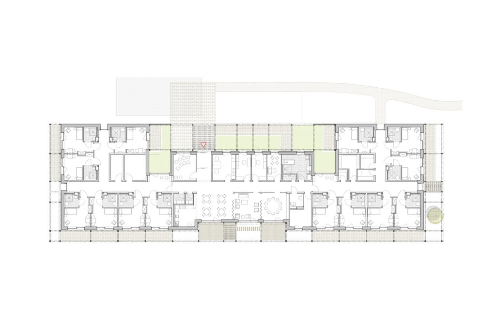 Gartenseitig wird das Haus von einer Pergola umrahmt. Hier liegen die Zimmer der Bewohner sowie Gemeinschaftsräume mit Glas überdachten Terrassen. Das Gebäude bietet zahlreiche Rückzugsorte mit Blick nach draußen sowie Räume für gemeinsames, familiäres Zusammenleben, mit hoher Aufenthaltsqualität. Die Fassadengestaltung mit Einschnitten und Oberlichtern sorgt für eine angenehme natürliche Belichtung der Flure.