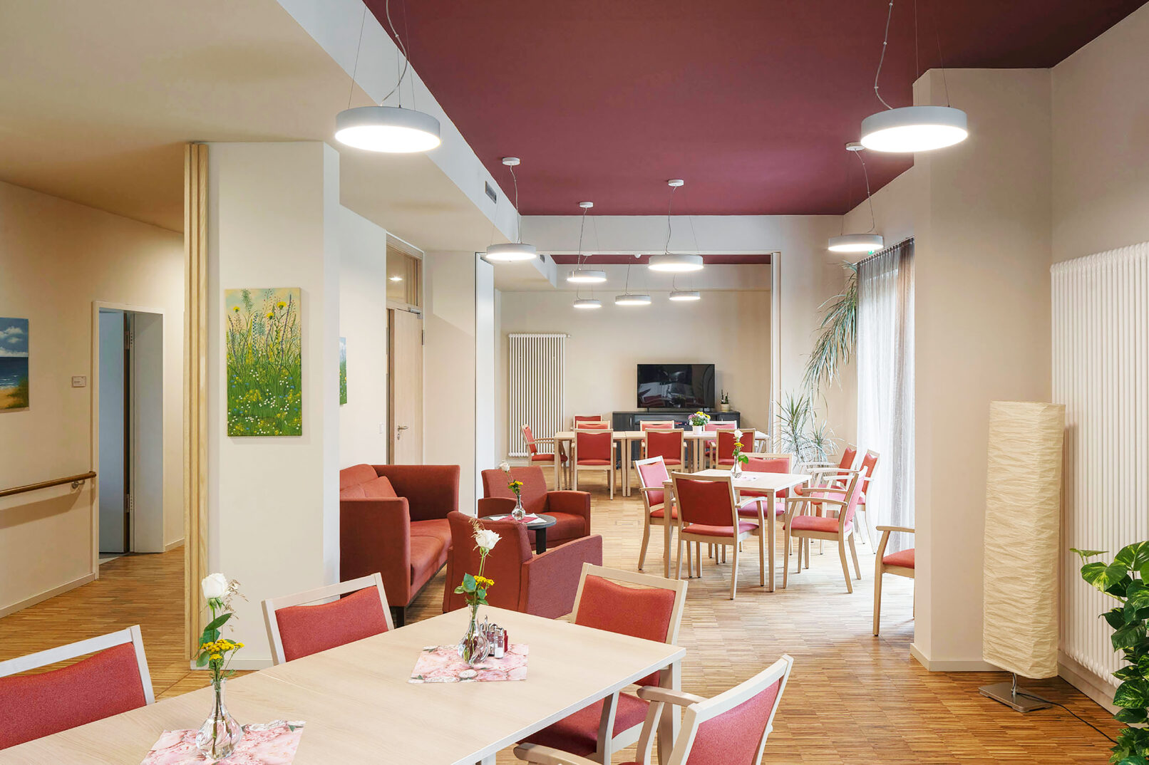 Das eingeschossige Hospiz Haus Markus bietet einen ruhigen und familiären Rückzugsort für 14 Gäste. Der Haupteingang und die Verwaltung sind zum Staudengarten ausgerichtet, der den Vorbereich des Hospizes schmückt. Im Zentrum des Gebäudes befindet sich ein großzügiger Gemeinschaftsraum mit einer Wohnküche, der durch eine mobile Trennwand räumlich flexibel gestaltet werden kann, um verschiedene Anlässe zu ermöglichen.