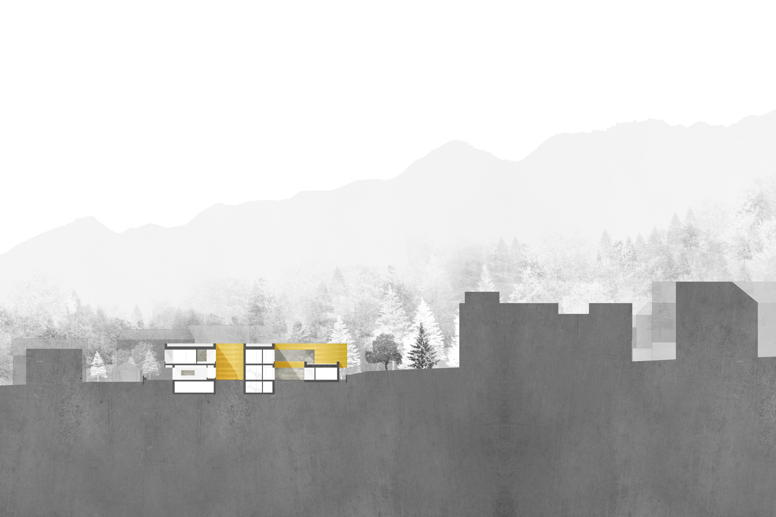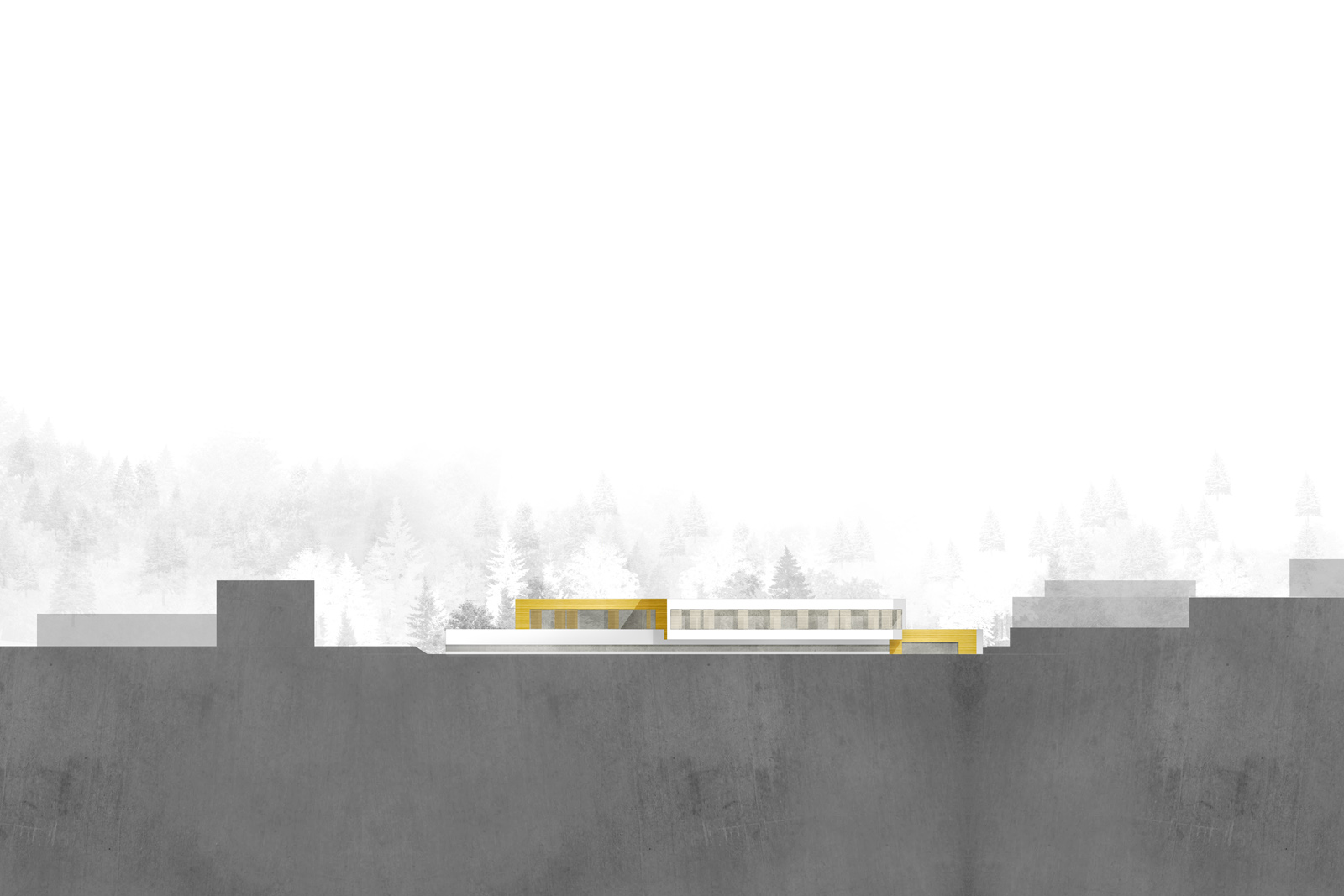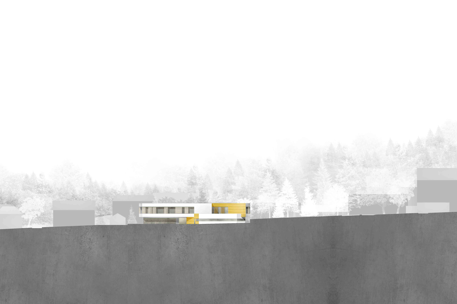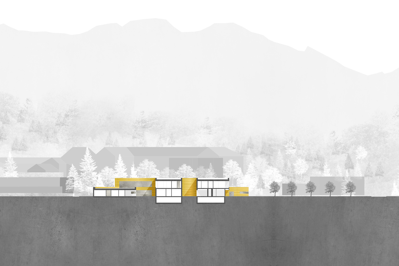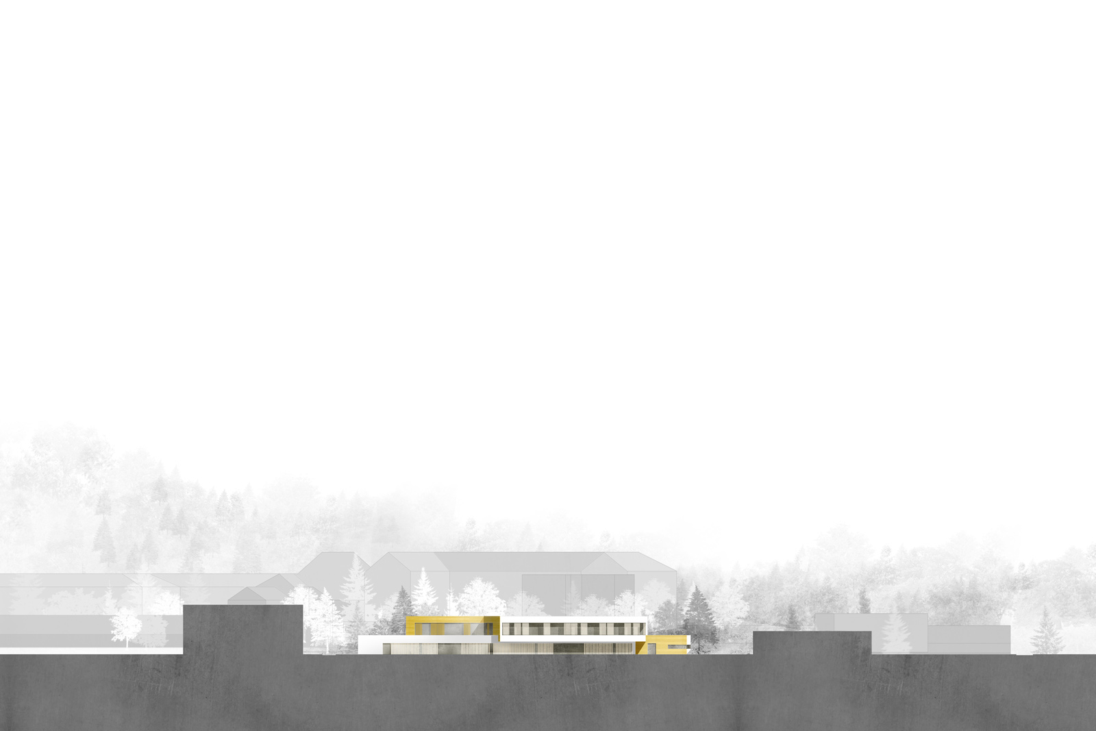Vier Höfe gliedern und organisieren das Gebäude sowohl horizontal als auch vertikal. Sie ordnen den Baukörper, schaffen Adressen und bilden Orientierungspunkte innerhalb des Hauses. Sie sind Orte des Rückzugs, aber auch des Zusammenseins. Das Erdgeschoss ist entlang seiner Magistralen parallel zum Hang verschoben. Nach Westen wird so der Haupteingang, nach Osten der geschützte Garten für die Bewohner gebildet.