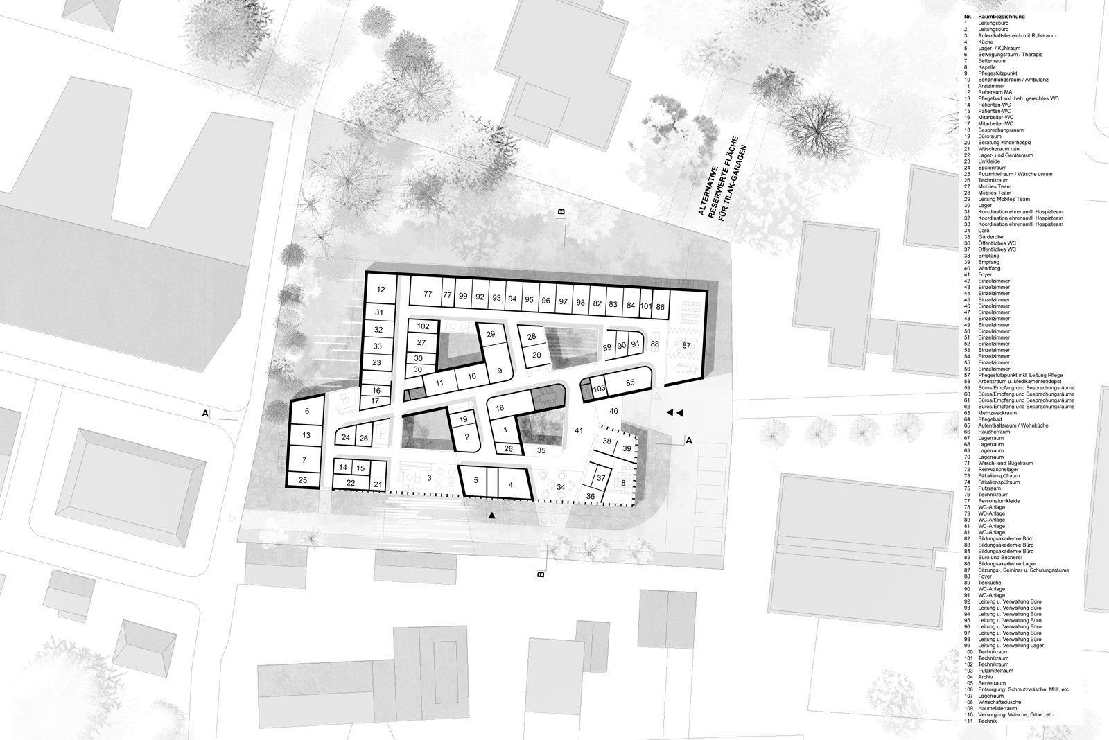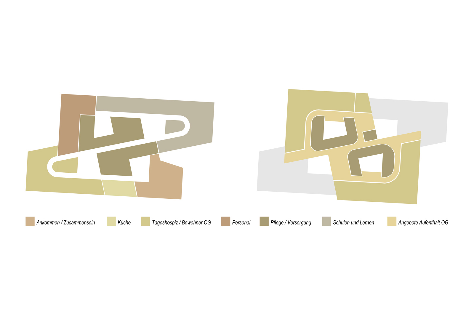 Der Entwurf organisiert unterschiedliche Nutzungen auf lediglich zwei Ebenen. Im Erdgeschoss liegt unmittelbar neben dem Haupteingang der Ausbildungsbereich. Die Verwaltung und Betreuung sind zentral im Haus positioniert. Gemeinsam mit dem Tageshospiz bilden sie den Sockel für die darüber liegende Hospiz- und Palliativstation mit ihren 14 Bewohnern. Über den repräsentativen Empfangsbereich mit Café und Kapelle sind alle Nutzungseinheiten über eine zentrale Erschließung zu erreichen.