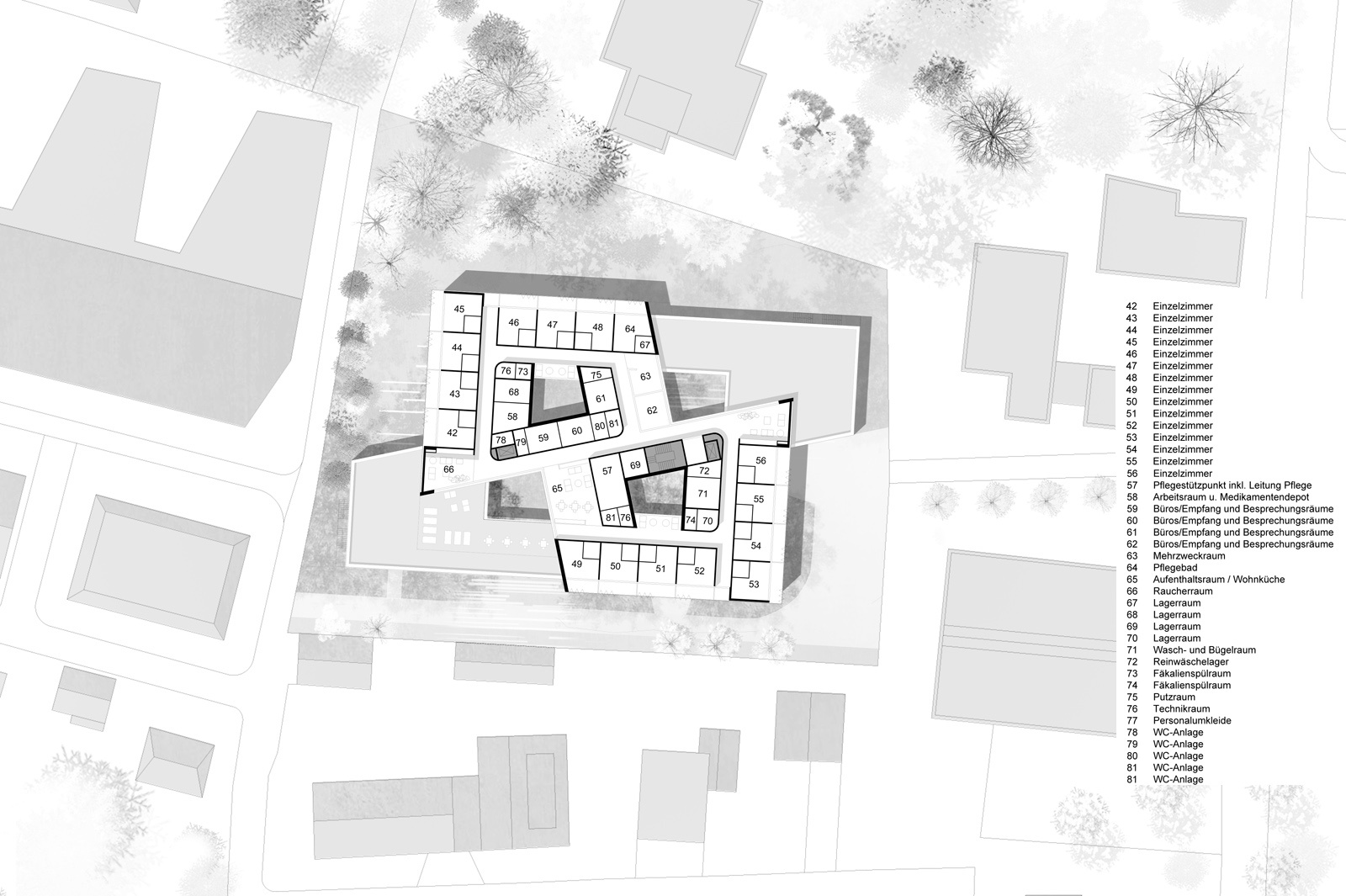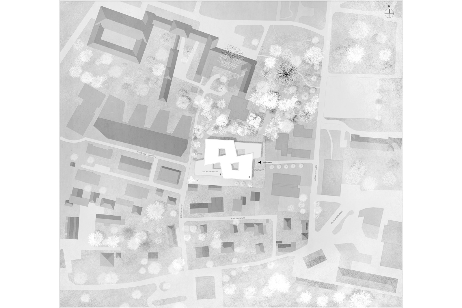 - Der Entwurf vermittelt städtebaulich zwischen den großvolumigen Krankenhaus-/Institutsgebäuden und den kleinteiligen Einfamilienhausstrukturen in seiner unmittelbaren Nachbarschaft