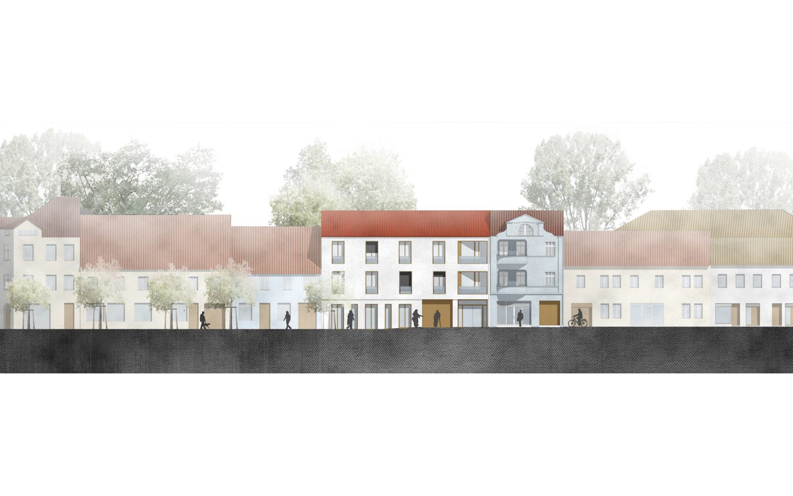 Der Entwurf für den Neubau des Ärztehauses in Gransee fügt sich homogen in den Kontext der weitgehend erhaltenen Struktur der Gebäude in der Rudolf-Breitscheid-Straße ein und bildet zusammen mit dem Bestandsgebäude Nr. 31 die Adresse für das Ärztehaus. Unser Entwurf schlägt den funktionalen Zusammenschluss von Bestand und Neubau vor und nimmt durch die „eingedrückte“ große Öffnung vor der Anmeldung der Praxen in der Fassade direkt Bezug auf das Bestandsgebäude.