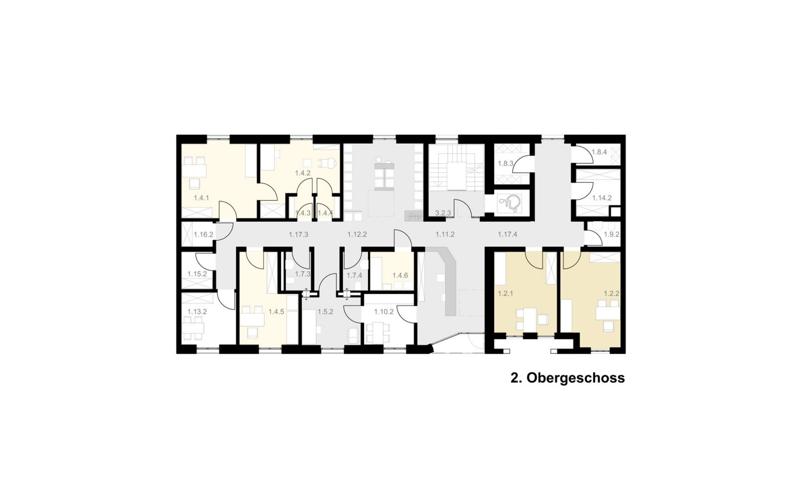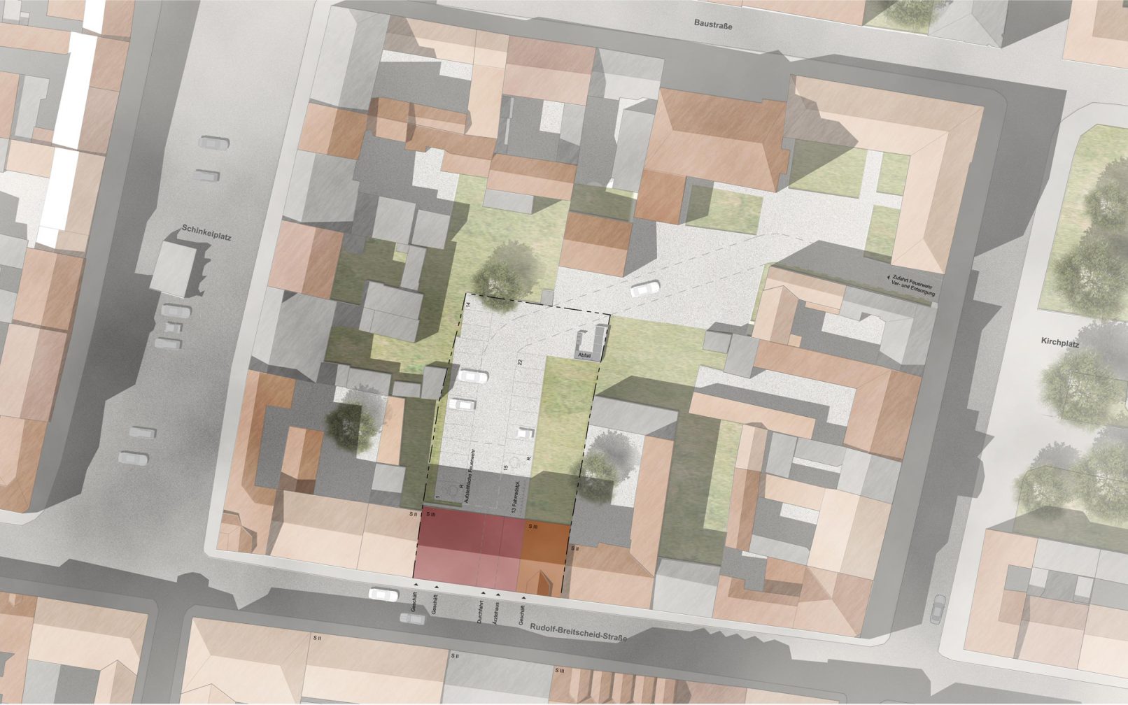Beide Gebäude werden miteinander verknüpft und durch ein neues Treppenhaus wirtschaftlich und strukturell sinnvoll erschlossen. Eine mögliche Erweiterung an der Nordseite des Bestandsgebäudes wird durch die Position des Treppenhauses und die vorgeschlagene Nutzung im Bestand leicht und ohne großen Aufwand möglich. Die durchgängige Tragstruktur über die Außenwände und eine tragende Mittelwand stellen eine einfache und langfristig flexible konstruktive Grundlage dar.