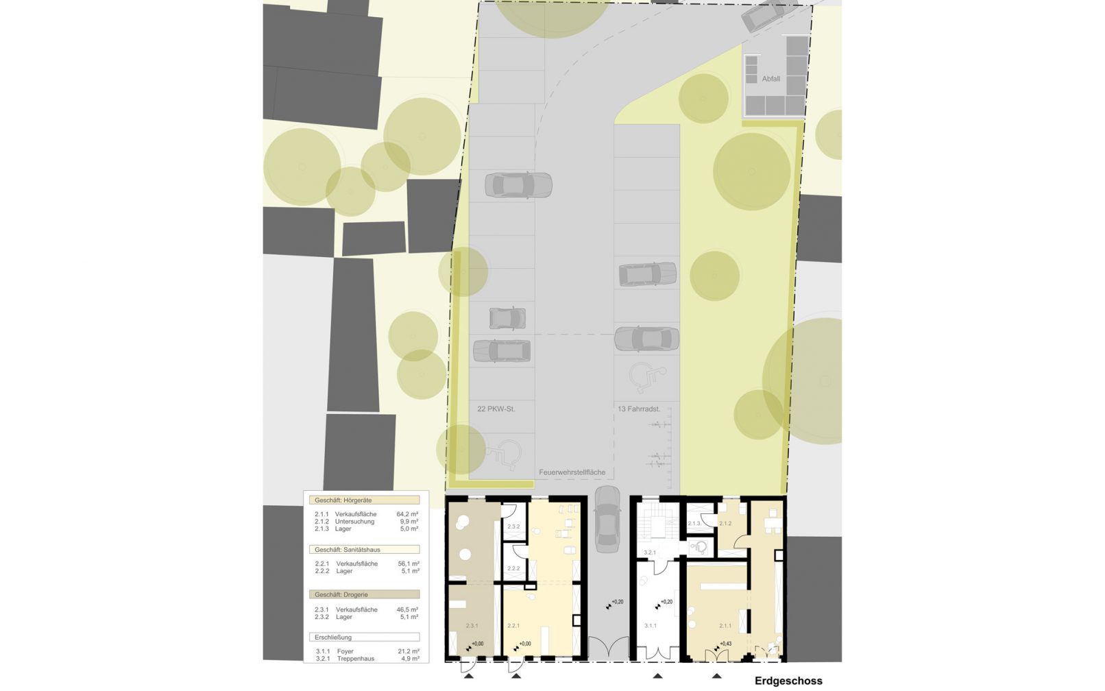 Auf der Grundlage der Geschossigkeit und der Ebenen des Bestandsgebäudes wurde eine durchgängig barrierefreie Erschließung der Gebäude entwickelt, auch die Grundstückserschließung ist stufenlos gestaltet. Sowohl der Neu- als auch der Bestandsbau sind durch einen Aufzug erschlossen, die Aufzugkabine ist für den Transport auf einer Trage und behindertengerecht ausgelegt. Ein WC für die Nutzung durch Rollstuhlfahrer ist zentral im 1. OG geplant. Alle Flure, Wartebereiche, Anmeldungen etc. stellen ausreichende Bewegungsflächen für Rollstuhlfahrergemäß DIN 18040-1 zur Verfügung.