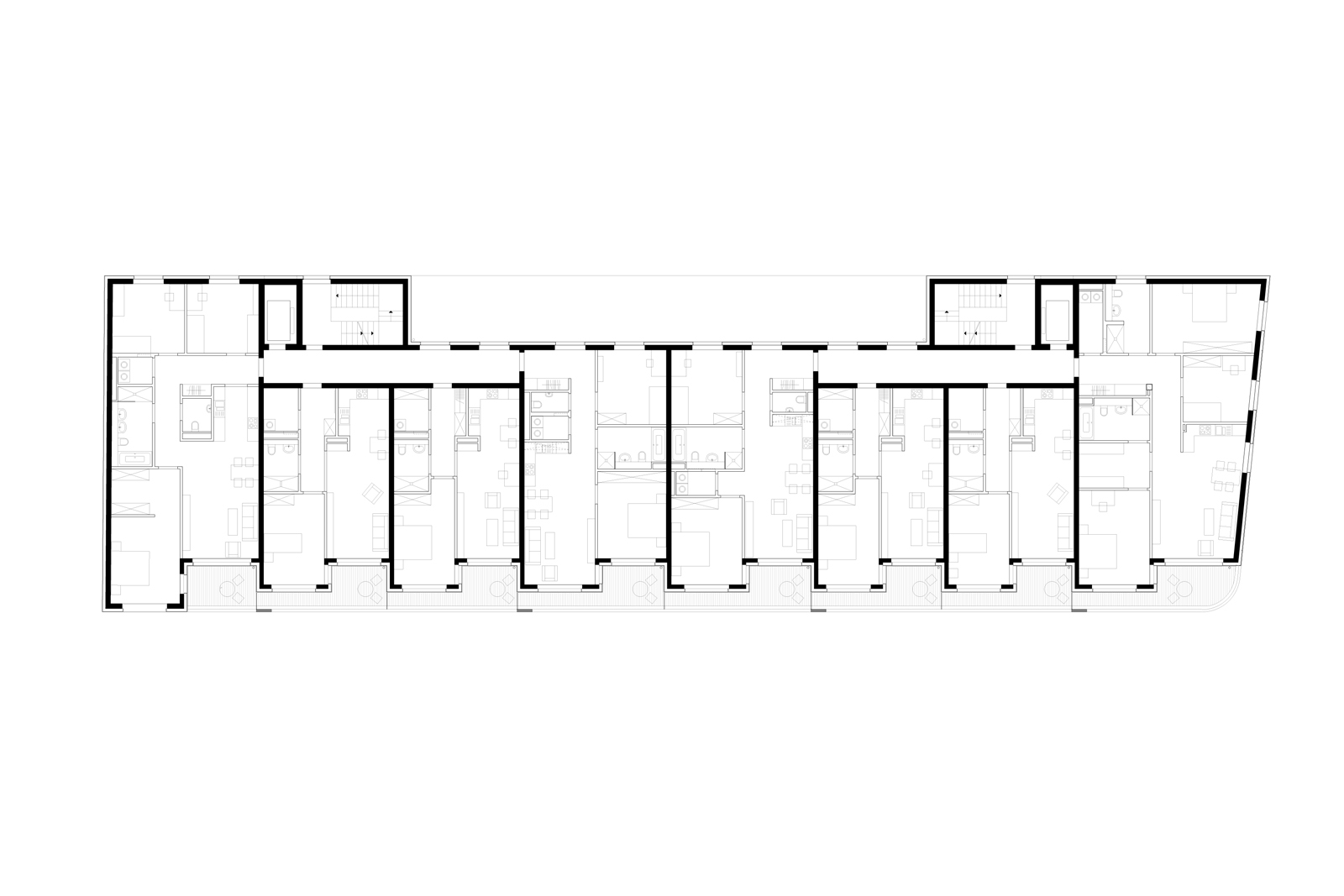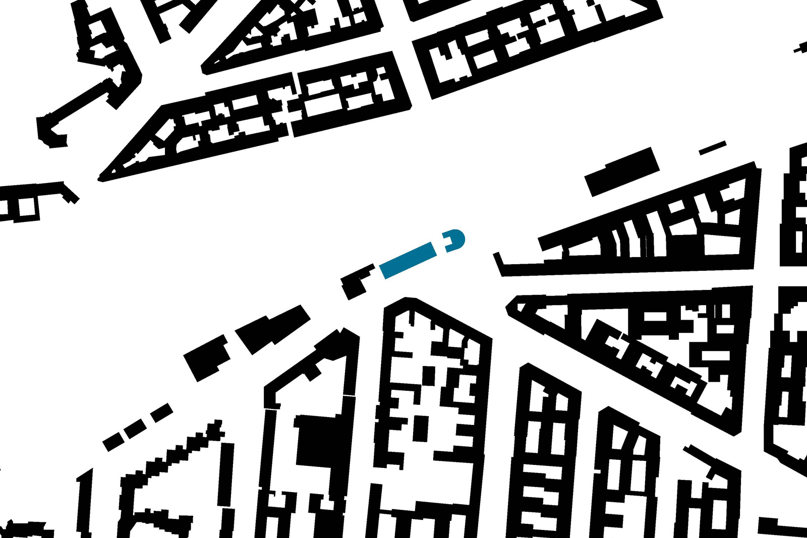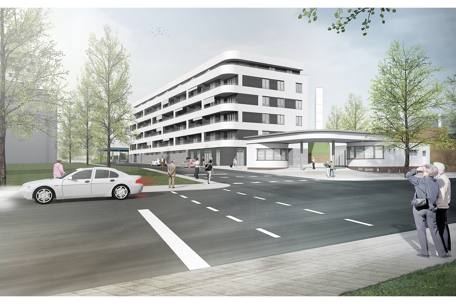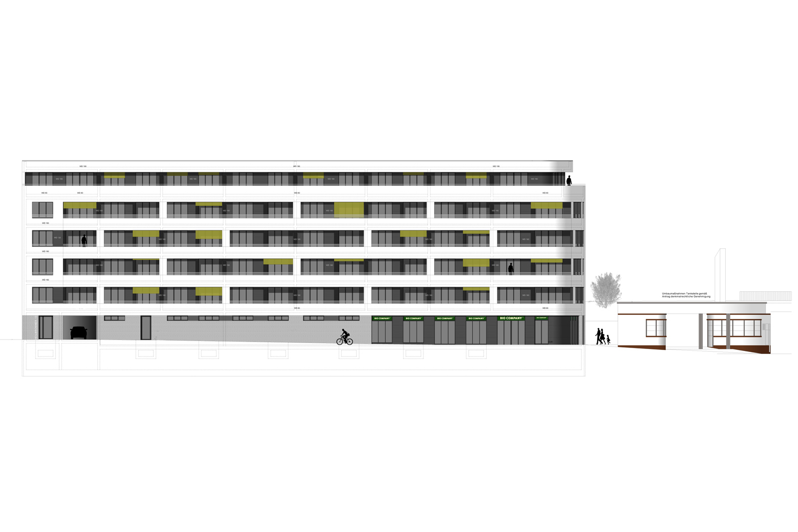 Im Neubau befinden sich ebenerdig Ladenflächen, in den Obergeschossen werden 40 Appartements als Zwei- bis Vier-Zimmer-Wohnungen realisiert. Im Untergeschoss wird ein Tiefgarage eingerichtet. Die sechste Etage staffelt sich mit einer umlaufenden Terrasse leicht zurück. In allen Wohnungen erreicht man Balkone und Terassen schwellenfrei, acht Appartements sind rollstuhlgerecht geplant.