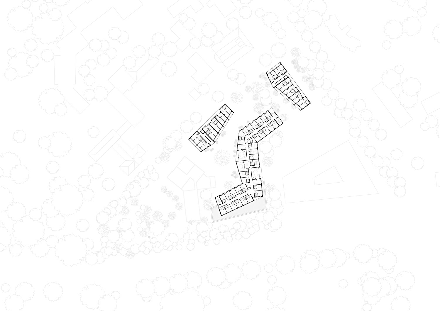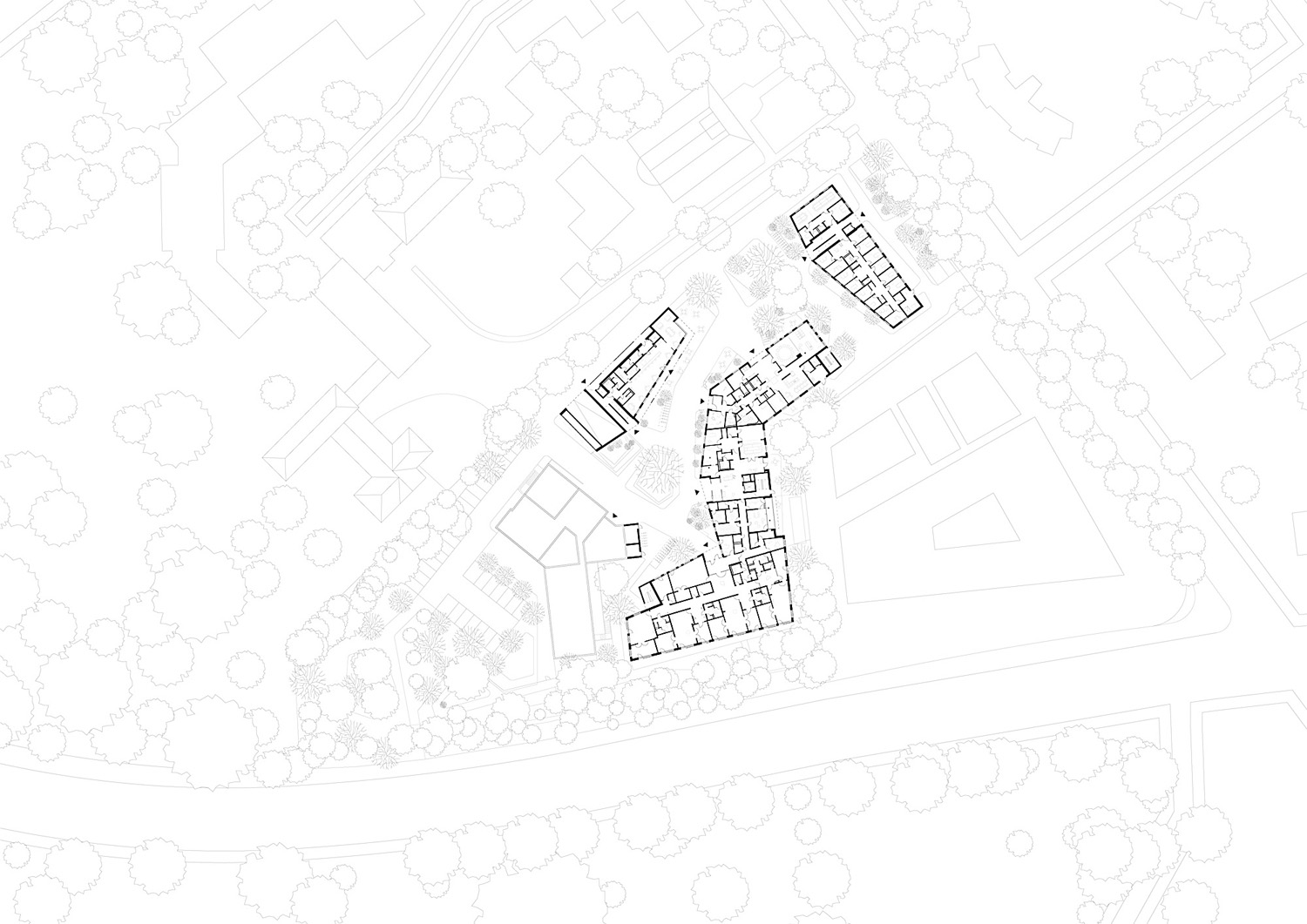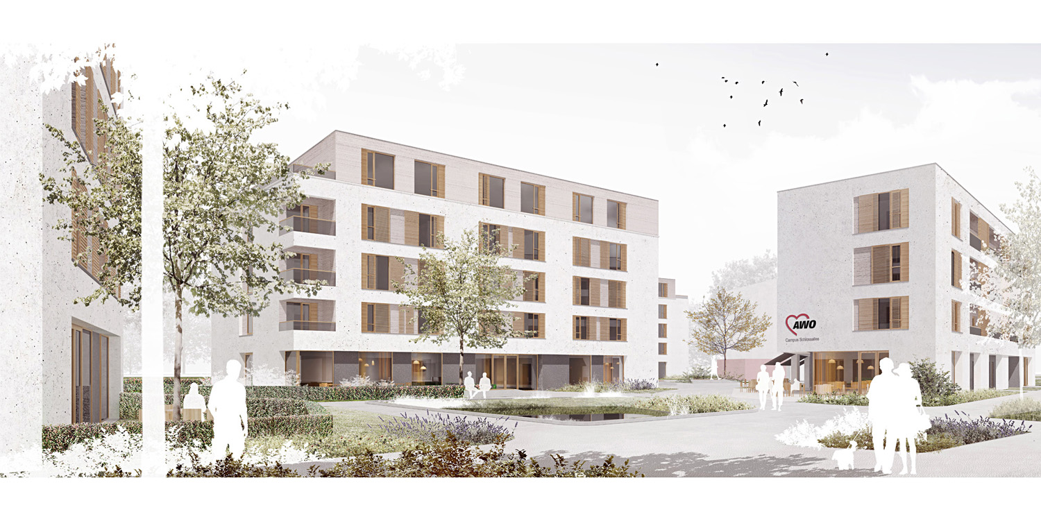 28 kompakt geschnittene Zwei-Zimmer- und 14 Drei-Zimmer Wohnungen im Seniorenwohnen verteilen sich auf das Haus an der Schlosskirche und das Campus Haus. Alle Wohnungen sind barrierefrei, insgesamt 18 uneingeschränkt mit dem Rollstuhl nutzbar geplant. Der Großteil der Wohnungen ist auf den ruhigen Campus ausgerichtet. Das Seniorenwohnheim ist in sechs Wohngruppen mit je 15 Bewohnern unterteilt. Fünf Plätze der insgesamt 90 Einzelzimmer werden dabei als Kurzzeitpflege betrieben. Die Aufenthaltsbereiche öffnen sich mit breiter Fensterfront zu den großen Loggien, eingestellte Küchen schirmen sie von den Fluren ab. Die Aufenthaltsräume orientieren sich zum Campus nach Westen wie auch zum Schulhof nach Osten, so dass identitätsstiftende Bezüge für jede Wohngruppe entstehen, welche eine entsprechende Innenraumgestaltung zudem unterstreicht. Kleine Sitznischen entlang der Flure bieten Raum für besondere Möbelstücke und regen zur Bewegung an, kleine Loggien laden ein zu einem Gespräch oder zum Balkongärtnern. Je zwei Wohngruppen sind zu einer Organisationseinheit zusammengefasst. Das Erdgeschoss ist im Sinne niedrigschwelliger und freilassender Atmosphäre gestaltet: Vom Foyer aus führt der Weg über die Lobby in den geschützten Garten. Ebenfalls zum Garten ausgerichtet liegt ein großer, multifunktional nutzbarer Raum. Hier können Feste und Mitarbeiterschulungen stattfinden.Die Aufenthalts- und Ruheräumen für das Personal liegen – auf kurzem Wege erreichbar – im Staffelgeschoss und partizipieren vom Dachgarten; dieser besondere Grünraum mit Blick in den Campus soll allen BewohnerInnen, BesucherInnen und Mitarbeitenden offenstehen. Personalwohnungen finden im Staffelgeschoss des Seniorenwohnheimes Platz.