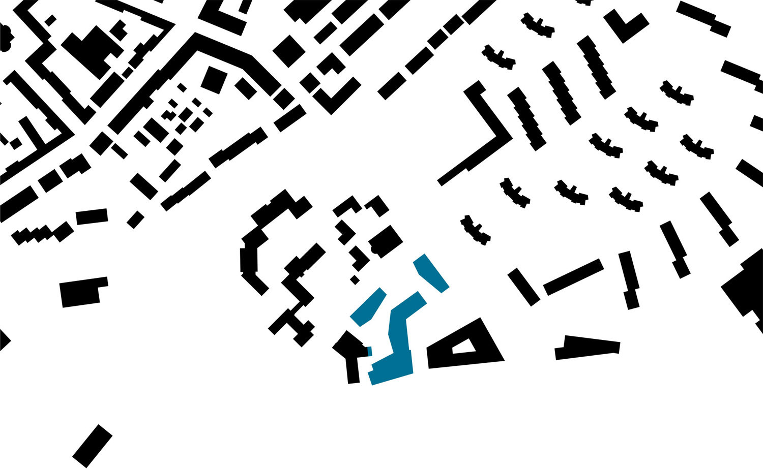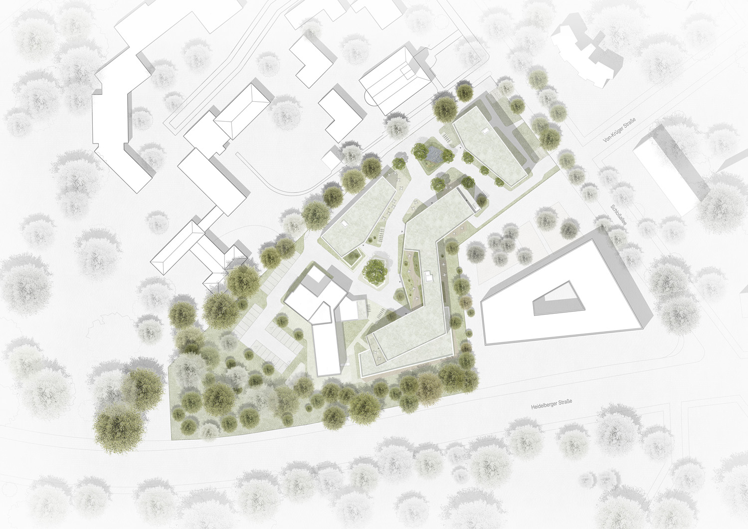 Trotz städtebaulicher Verdichtung strebt der neue Campus Schloßallee maximale Durchlässigkeit im Quartier an: Blickbeziehungen vom Platz an der Schlosskirche nach Süden bis zum Eingang der neuen KiTa und nach Osten zum neuen Schulgarten schaffen Offenheit und vernetzen die unterschiedlichen Stadträume. Die städtebauliche Figur bindet die Schlosskirche als identitätsstiftenden Stadtbaustein über einen Platzraum ein. Der Campus öffnet sich damit zum westlichen Nachbarn und ermöglicht eine zukünftige gemeinsame Weiterentwicklung des Quartiers. Nach Osten bildet das Ensemble einen kräftiges Rückgrat zum Schulgelände, schirmt den Campus damit ab und profitiert gleichzeitig von der anregenden Nachbarschaft zum Schulgarten. Durch die maßstäbliche Gliederung seiner Baumasse nimmt sich das „Haus an den Gärten“ zurück. Das „Haus an der Schlosskirche“ adressiert den Campus, verknüpft ihn mit dem Wohnumfeld und trägt zur niedrigschwelligen und wenig institutionellen Erscheinung des Campus bei. Er soll der fußläufigen Erschließung vorbehalten sein; Taxivorfahrt und Anlieferung sind möglich. Die Wegeflächen werden dafür nach den Prinzipien des „shared space“ angelegt. Alle oberirdischen Stellplätze und die Tiefgarage werden jedoch über die westliche Erschließungsstraße erreicht ohne den Innenhof des Campus zu tangieren.