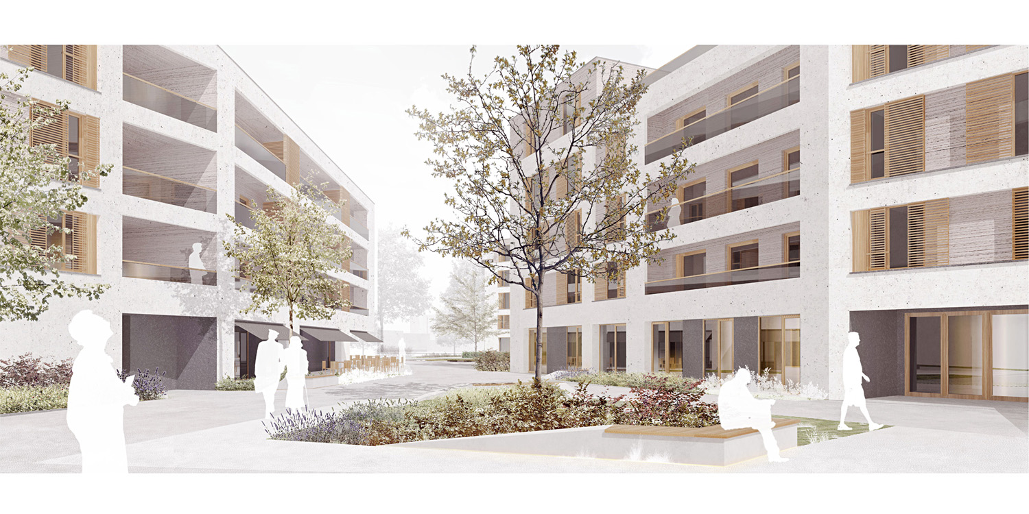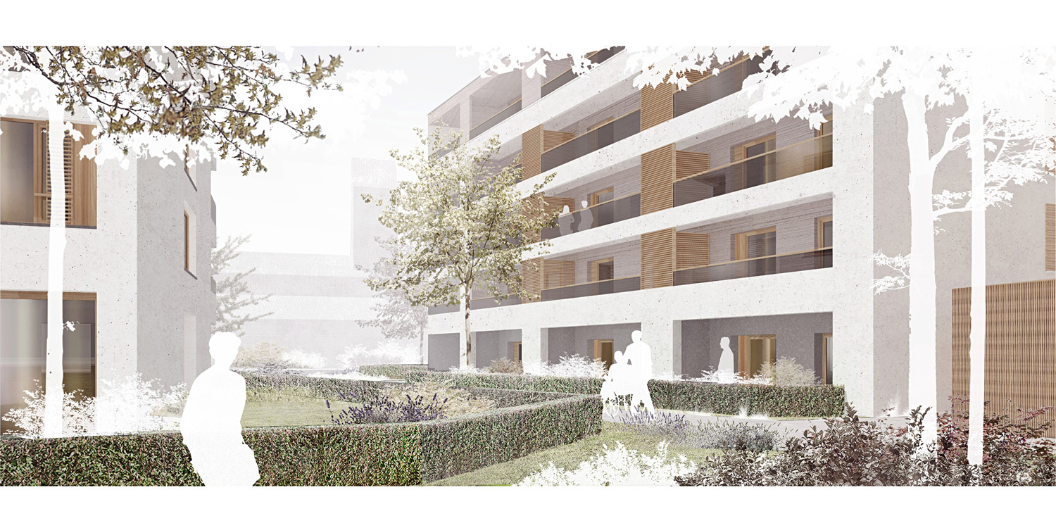 Auf der Innenhofseite des Campus finden sich gut einsehbar alle Eingänge: Das Café wird kommunikativer Mittelpunkt und zum einladenden Ort für die ganze Nachbarschaft. Anregende Gemeinschaftsflächen sowie geschützte Nutzergärten zeichnen die Freianlagen aus. Nach Osten und Südosten reihen sich die Nutzergärten auf. Im Unterschied zum offenen Charakter des Campus sind sie ganz auf die spezifischen Bedürfnisse der Nutzer ausgerichtet und bieten damit assistenzfrei nutzbare Außenräume. Der gewachsene Baumbestand und die Lage am Schulgarten versprechen naturraumorientierte Qualitäten.