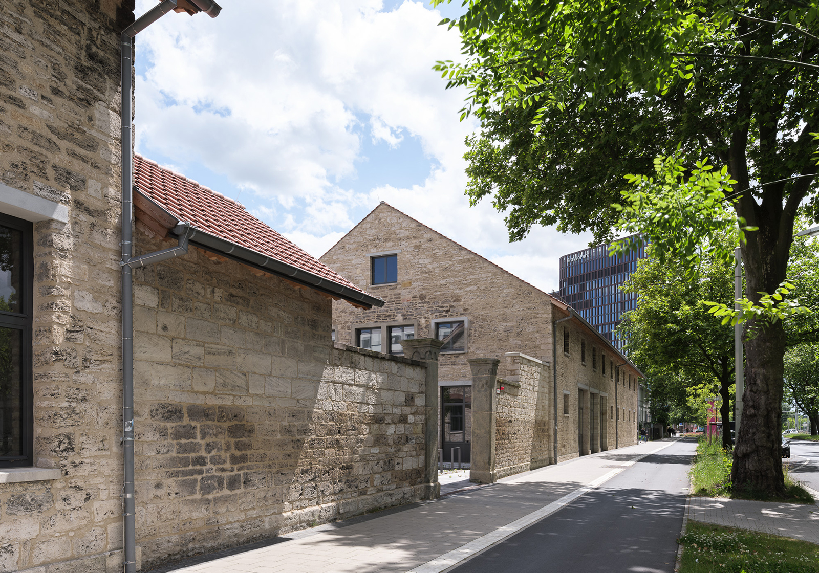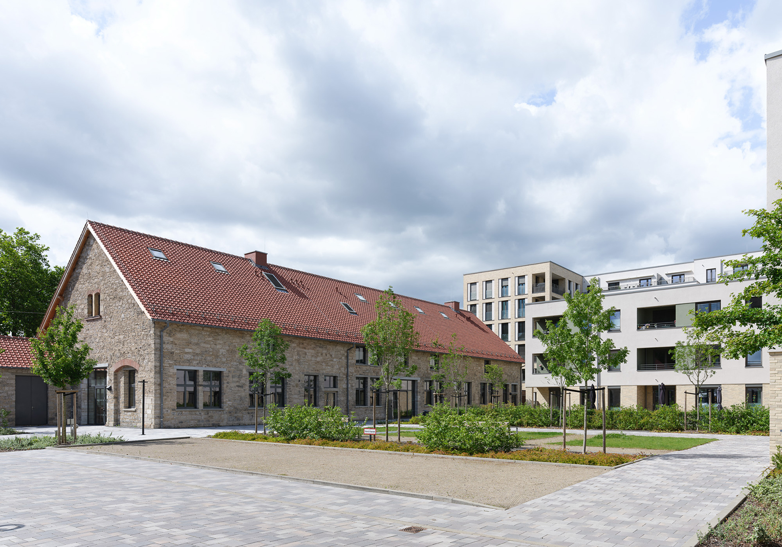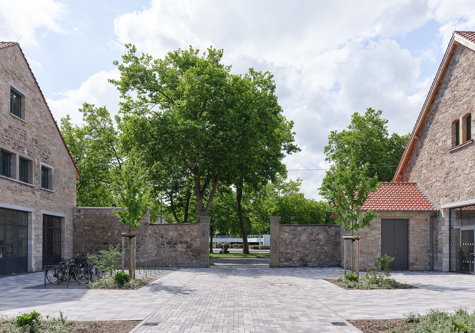Respekt vor der überlieferten Struktur und die Umnutzung der Bestandsgebäude kennzeichnen den Entwurf in mehrfacher Hinsicht. Für die ehemaligen Stallscheunen konnten mit dem Café, dem Theater und der Förderwerkstätte Nutzungen gefunden werden, die vom Charakter der historischen Gebäude profitieren; deren rauer Charakter konnte als Reminiszenz an die wechselvolle Vergangenheit der Bauwerke erhalten und neu interpretiert werden.