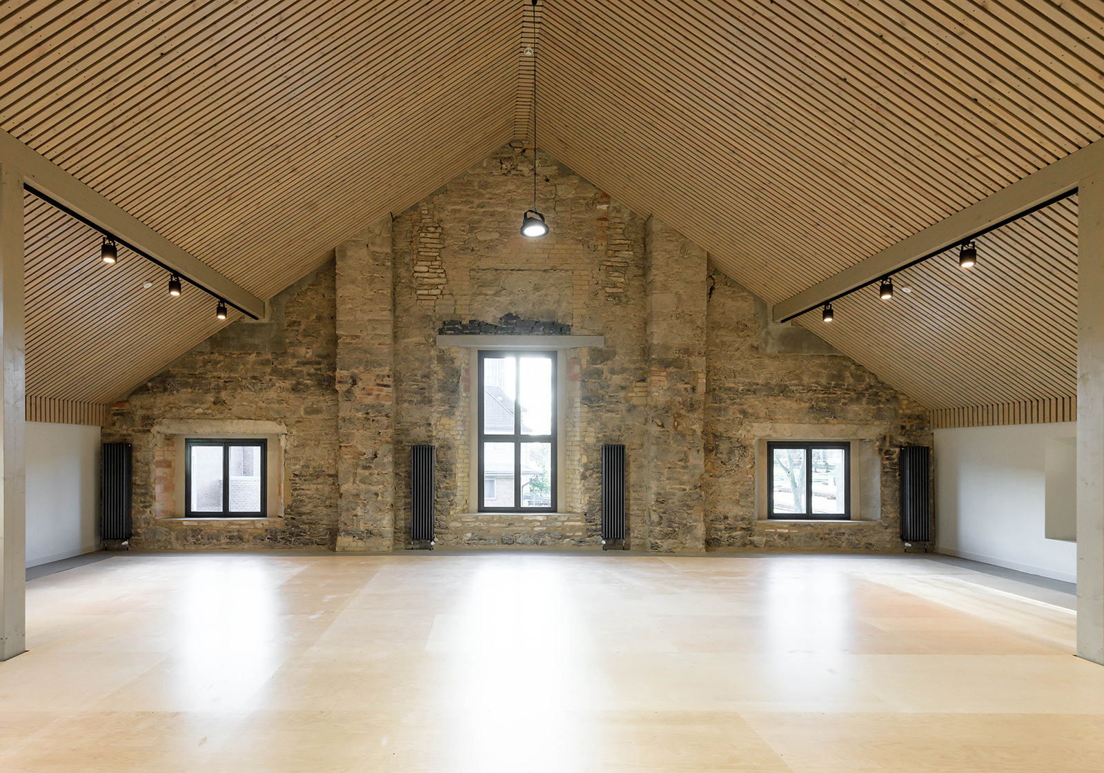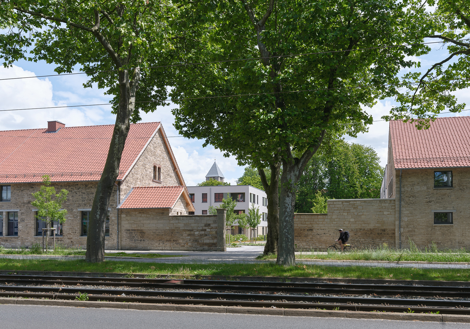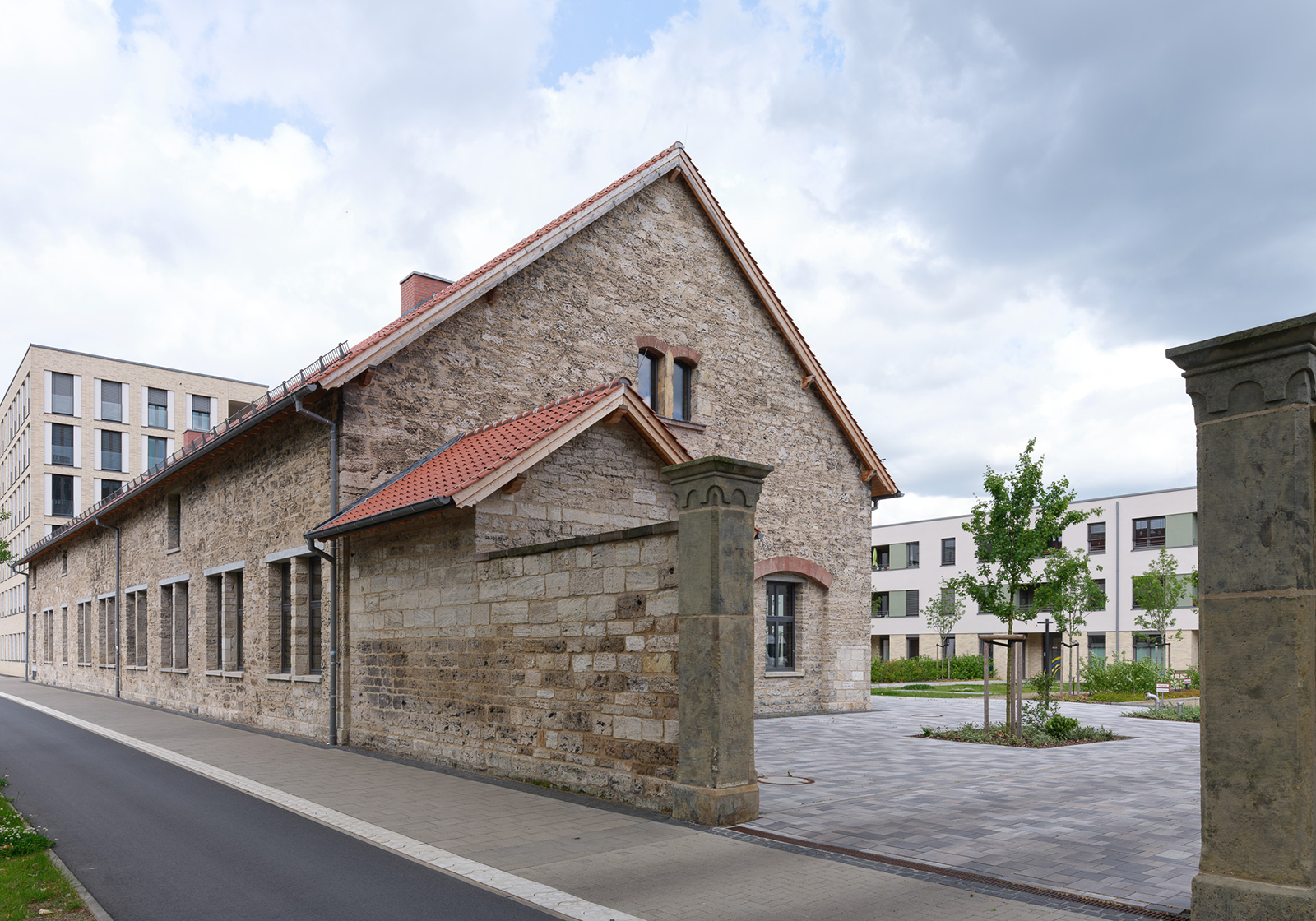 Respekt vor der überlieferten Struktur und die Umnutzung der Bestandsgebäude kennzeichnen den Entwurf in mehrfacher Hinsicht. Für die ehemaligen Stallscheunen konnten mit dem Café, dem Theater und der Förderwerkstätte Nutzungen gefunden werden, die vom Charakter der historischen Gebäude profitieren; deren rauer Charakter konnte als Reminiszenz an die wechselvolle Vergangenheit der Bauwerke erhalten und neu interpretiert werden.