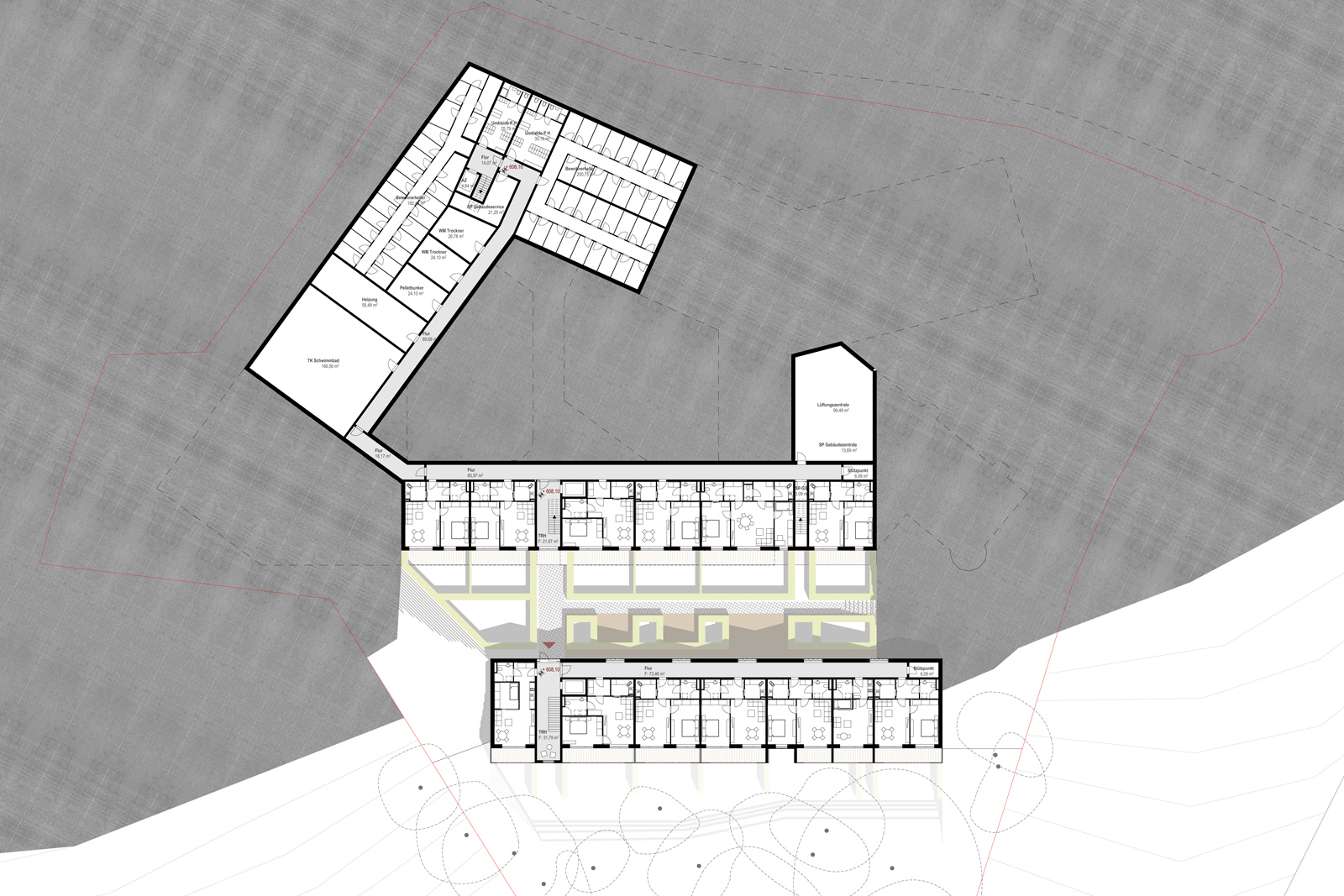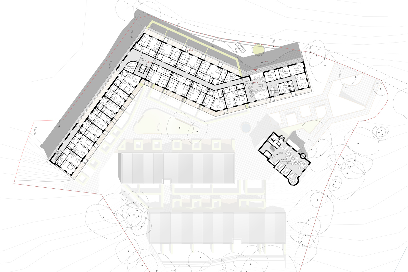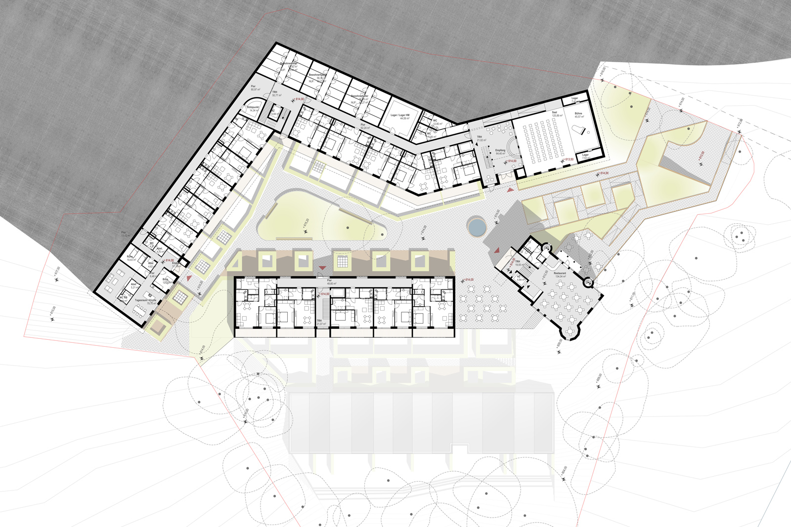 Das Haupthaus bildet den Rücken des Ensembles. Mit seiner mehrfach geknickten, dem Hang folgender Form schafft es qualifizierte Räume: den Eingangsbereich mit Vorfahrt auf der Ostseite, auf der Westseite den terrassierten „Kulturhof“, den zentralen Platz rund um den Brunnen und den Wohnhof. Das Gebäude dominiert trotz seiner Größe weder das „Waldschösschen“ noch die Nachbarschaft. Dazu tragen besonders die schmal gehaltenen signifikanten Giebelfassaden bei.
